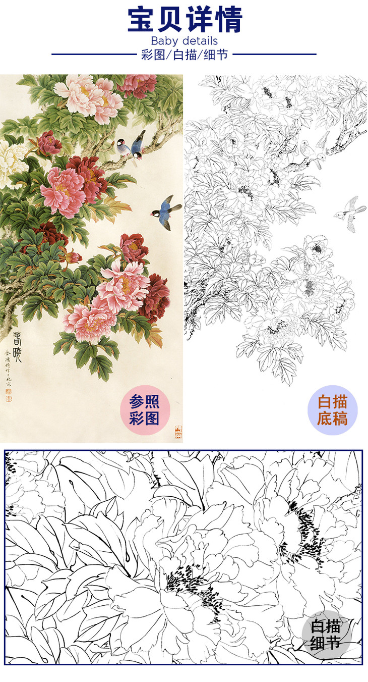 竖幅工笔花鸟白描底稿-四尺六尺牡丹-金鸿钧《春晓》-多种白描尺寸可选-JR01