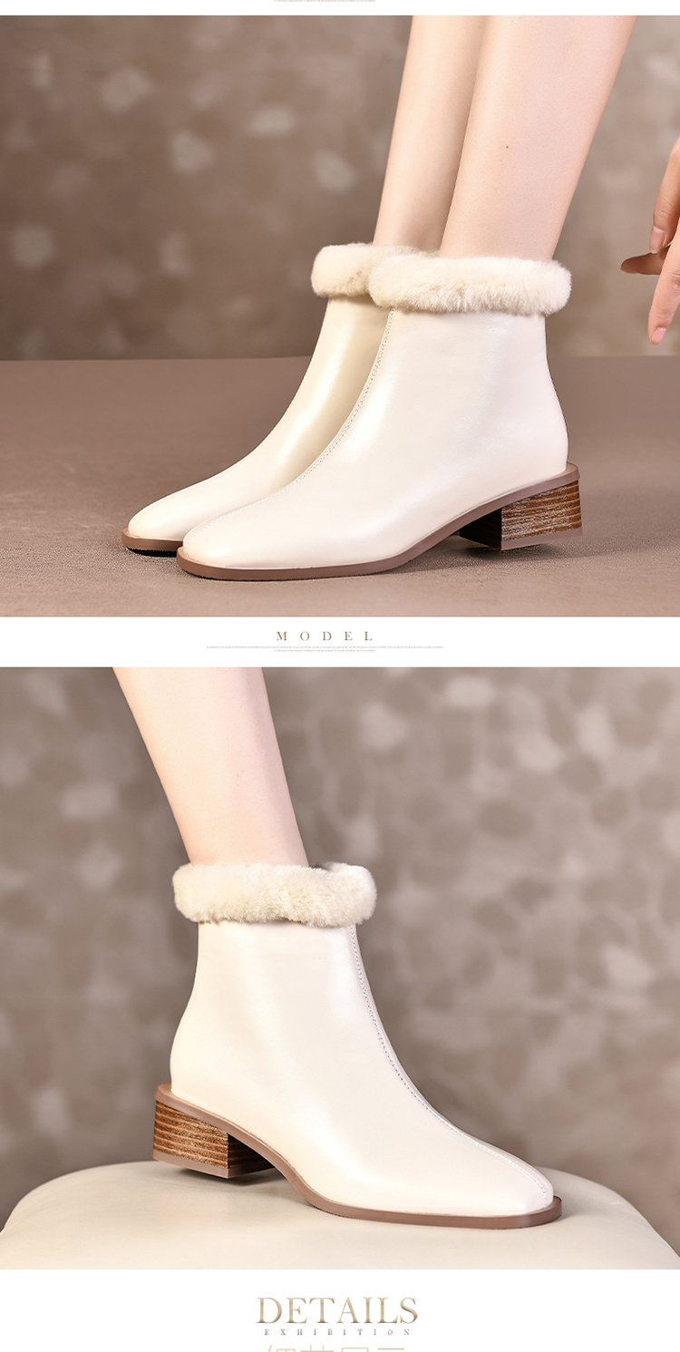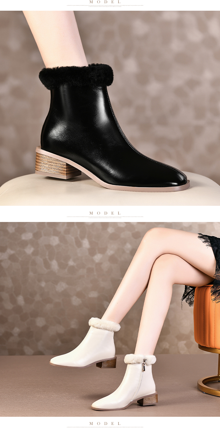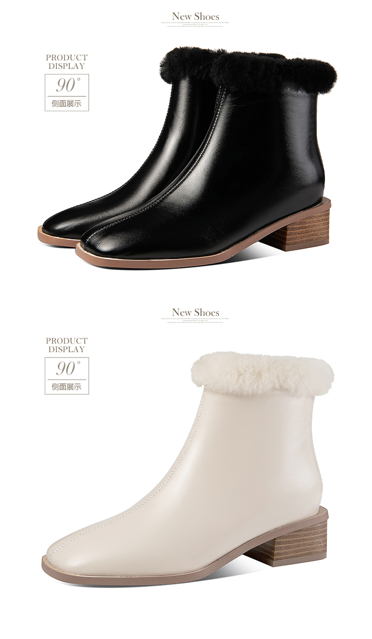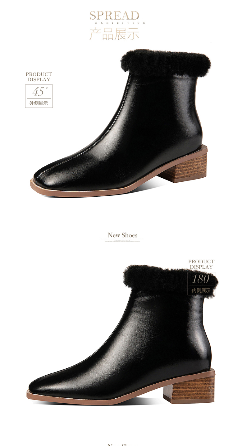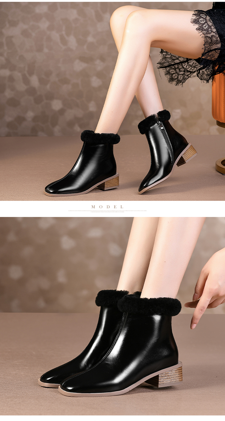 TJXY-XF8175 秋冬新款方头低跟纯色真皮骑士靴侧拉链羊羔毛短筒舒适百搭中跟靴