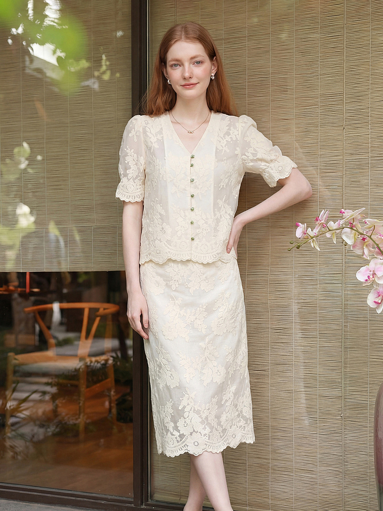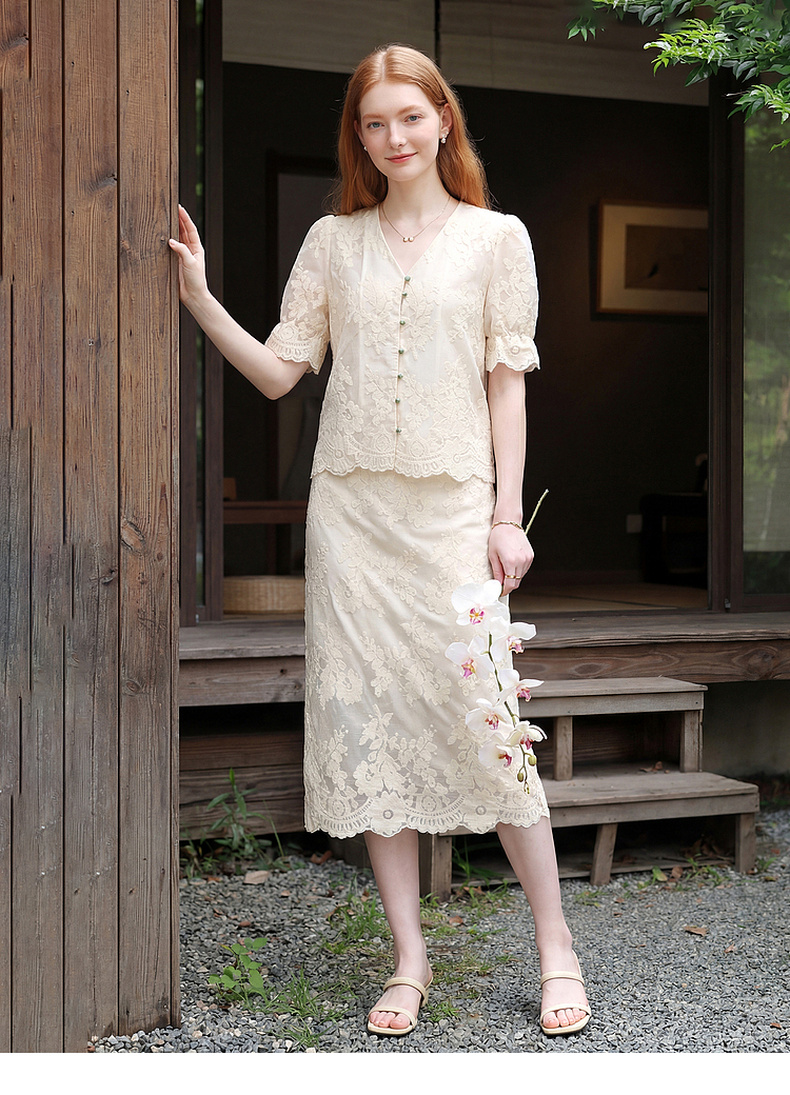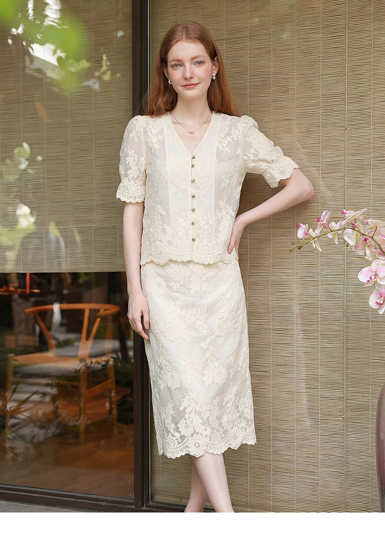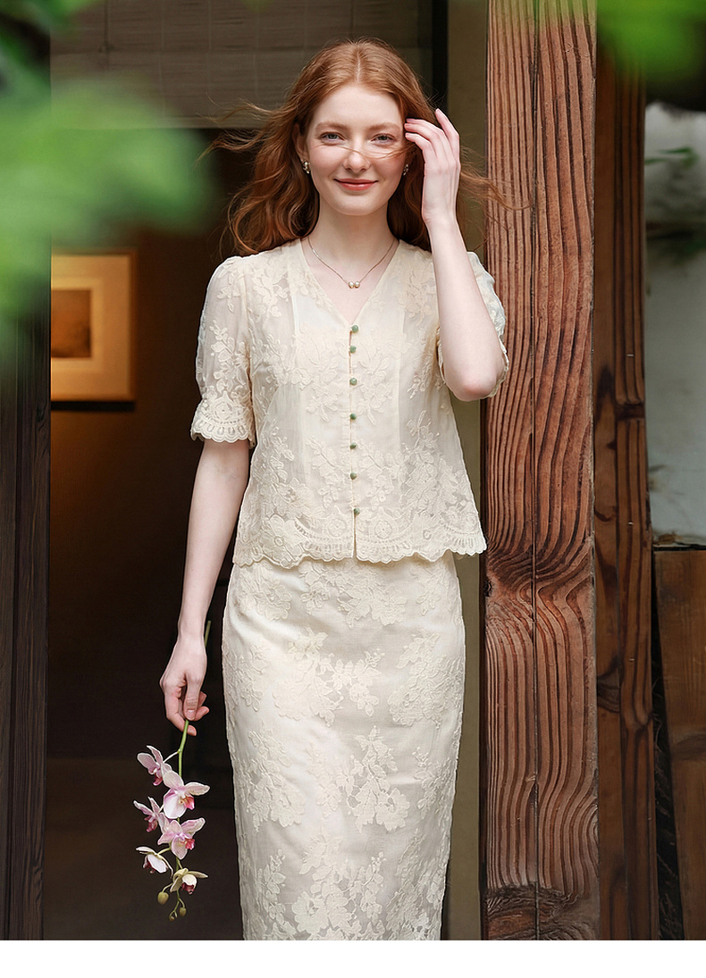 天猫同步【蕾丝两件套】拉夏贝尔/La Chapelle法式V领排扣刺绣短袖小衫半身裙老钱松弛感新中式两件套