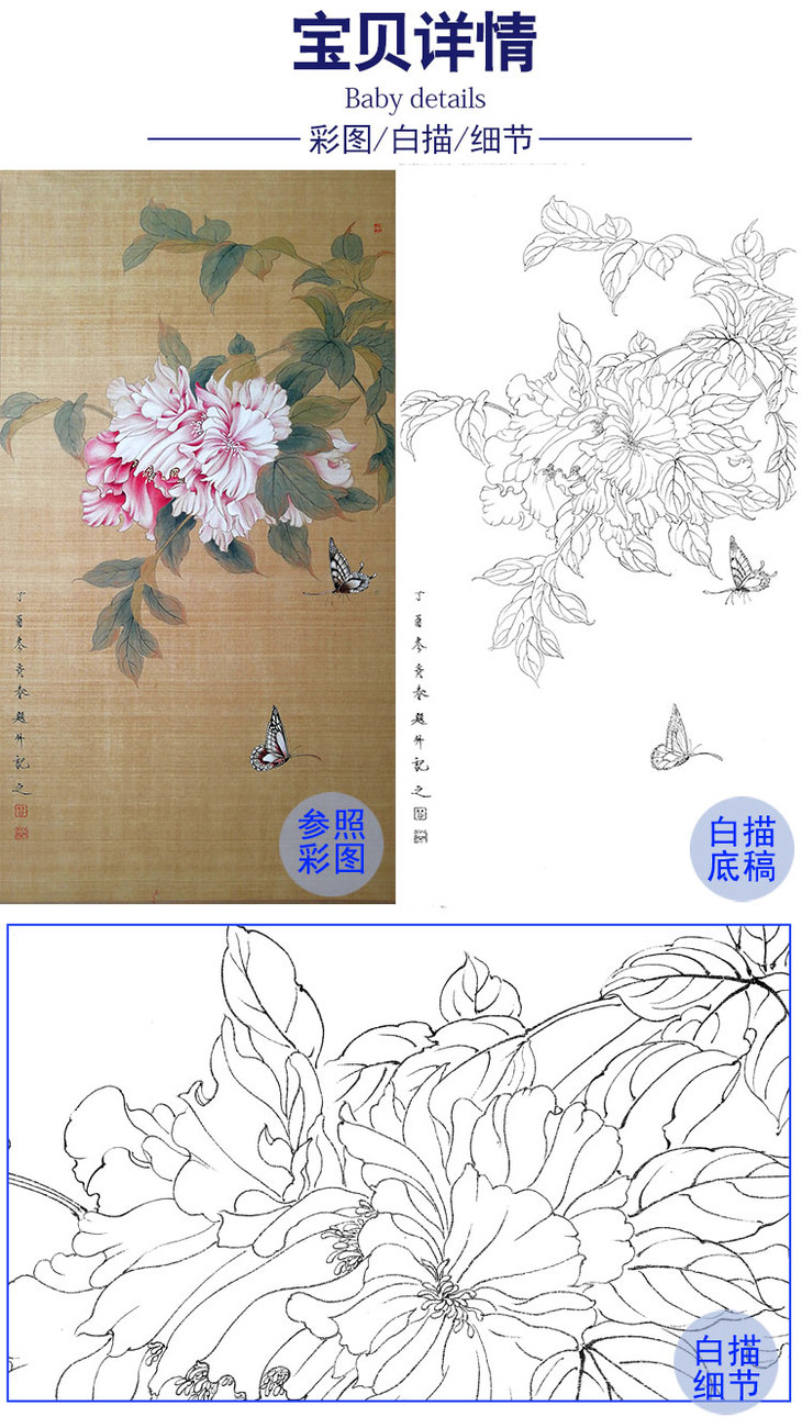 楚彦春竖幅复古风工笔花鸟白描底稿-牡丹-多种白描尺寸可选-CY02