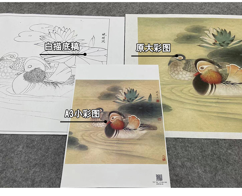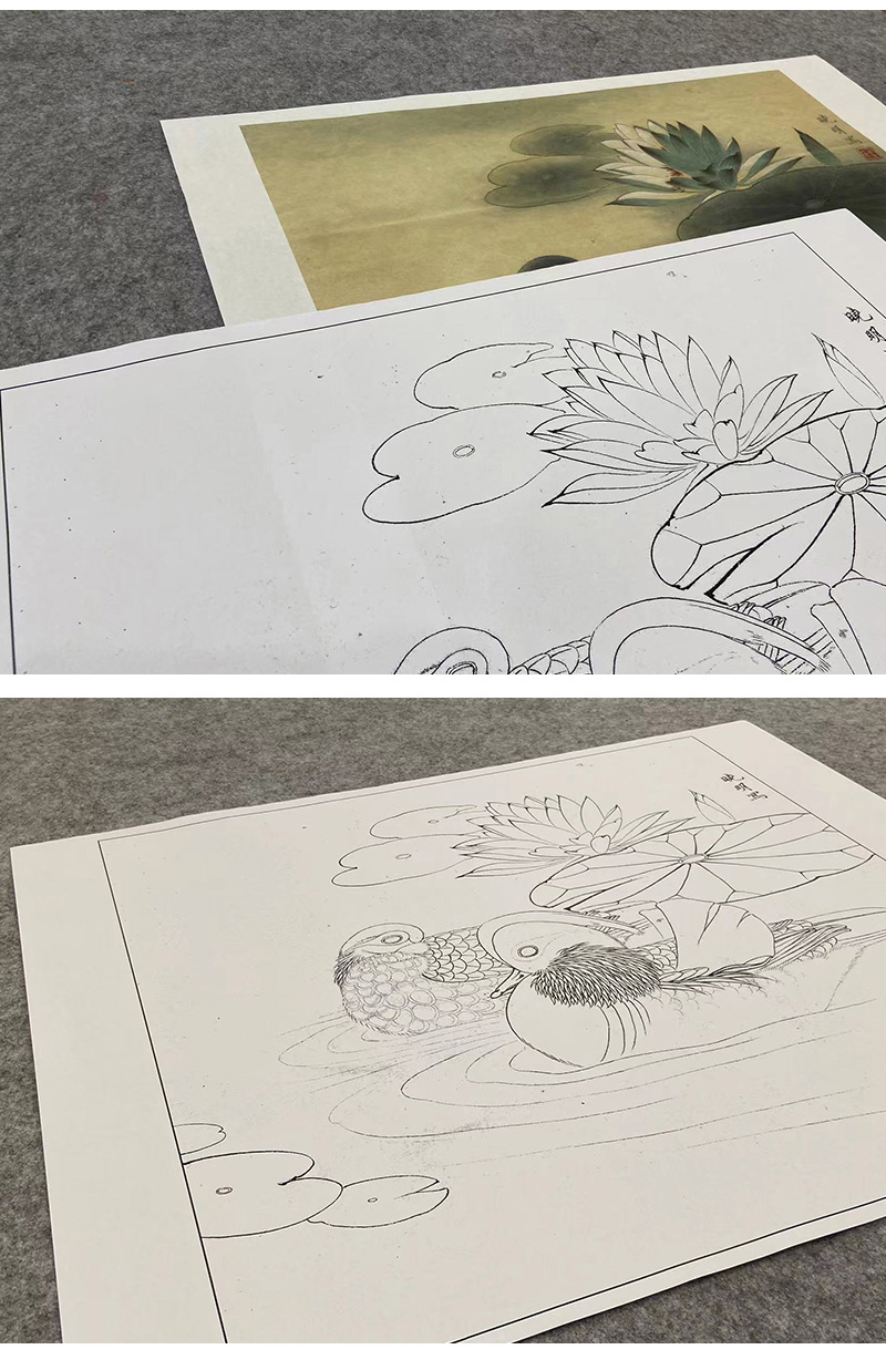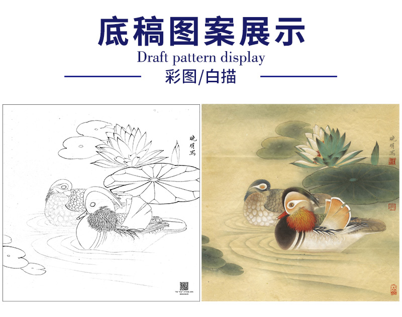 【大彩图】李晓明工笔画白描底稿斗方小品《睡莲鸳鸯》荷花临摹勾线花鸟线稿K109