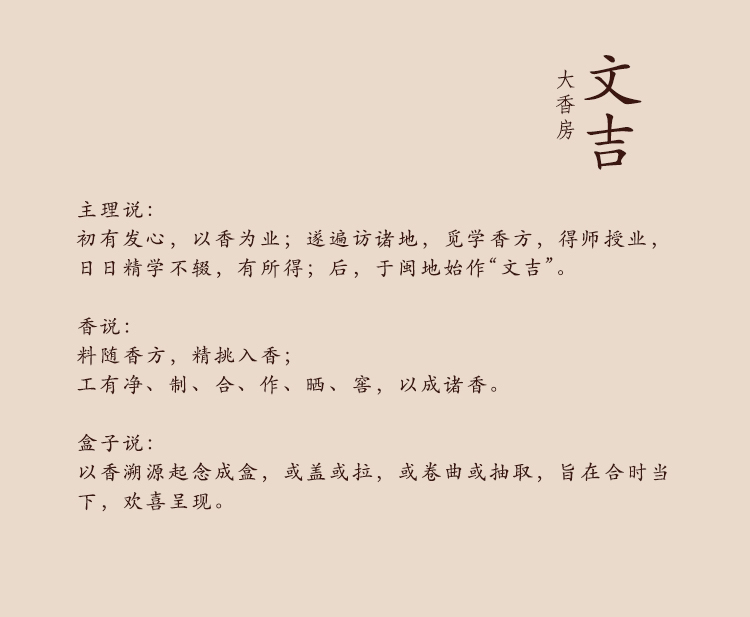 初有发心,以香为业;遂遍访诸地,觅学香方,得师授业,日日精学不辍,有所得;后,于闽地始作“文吉”。