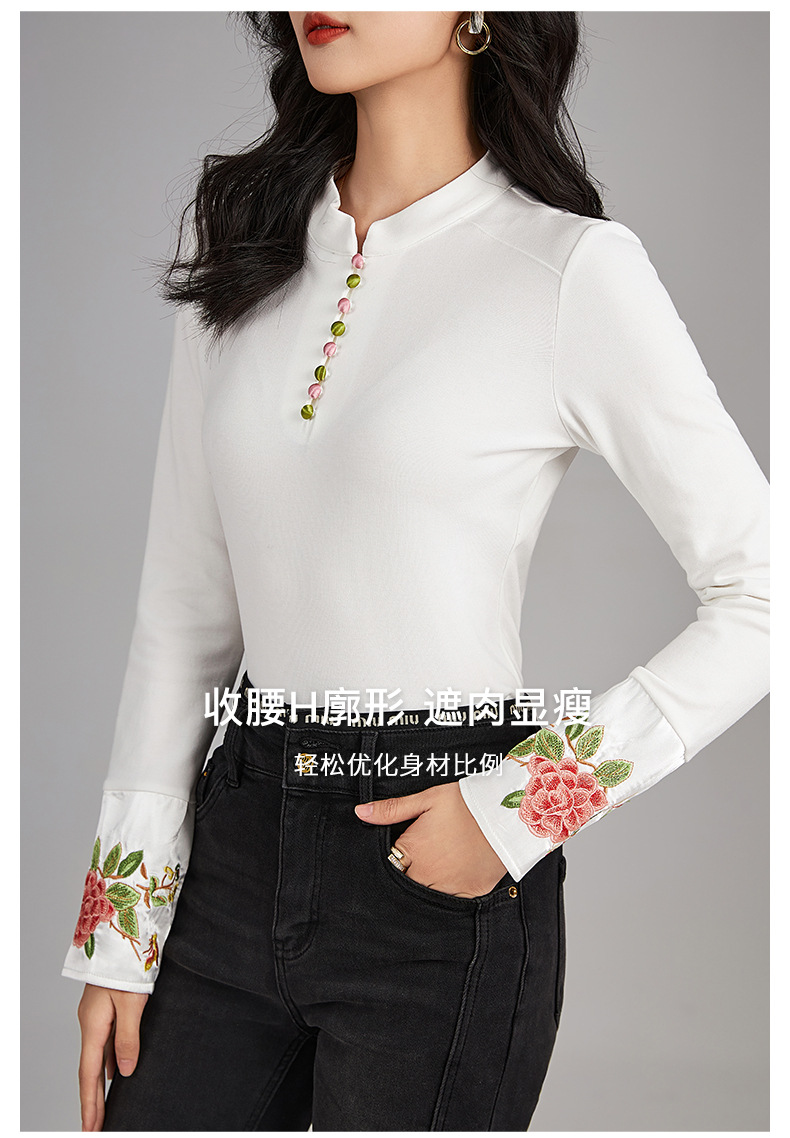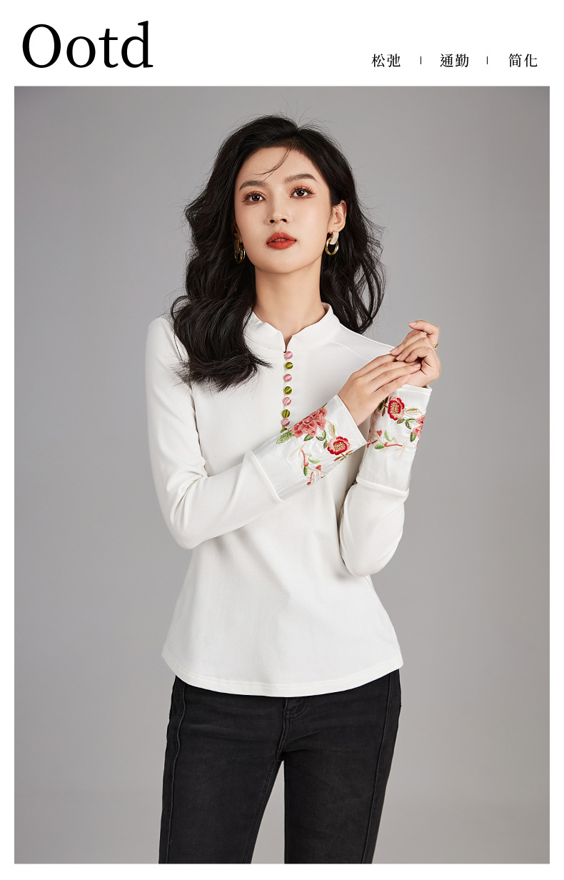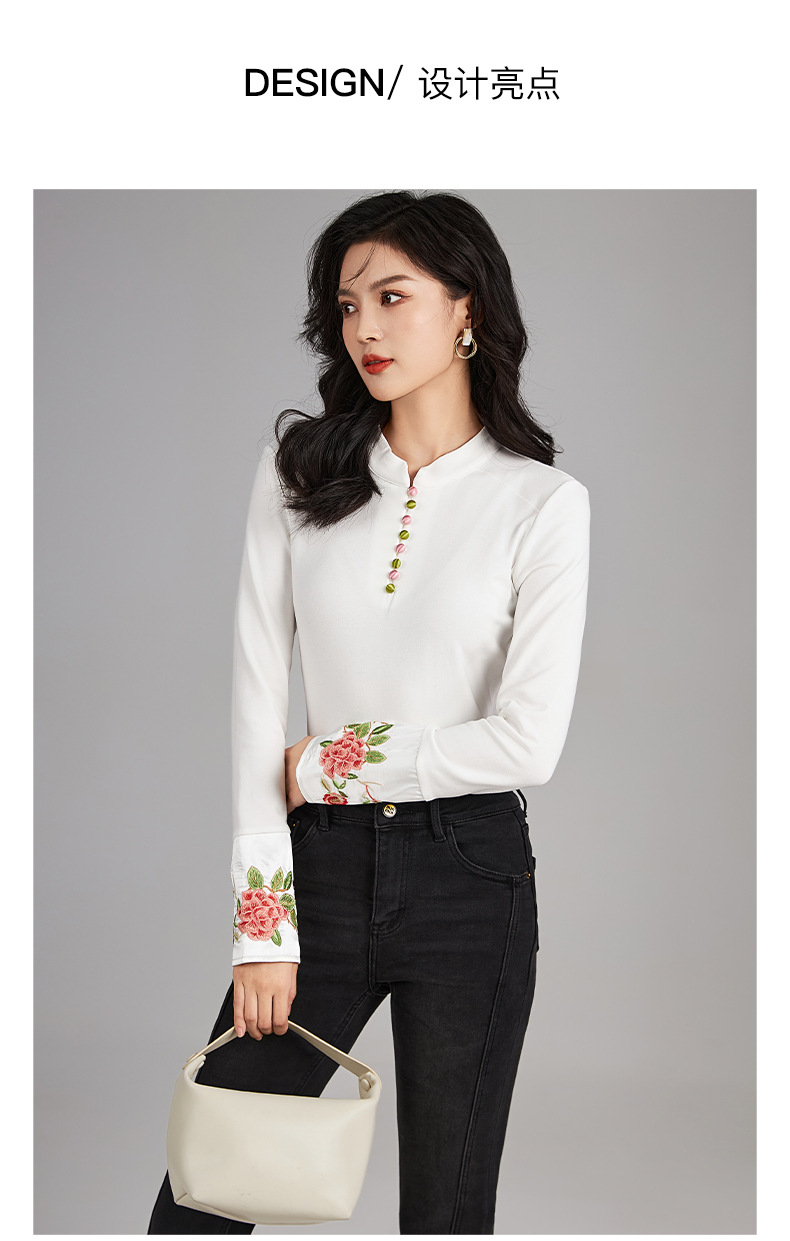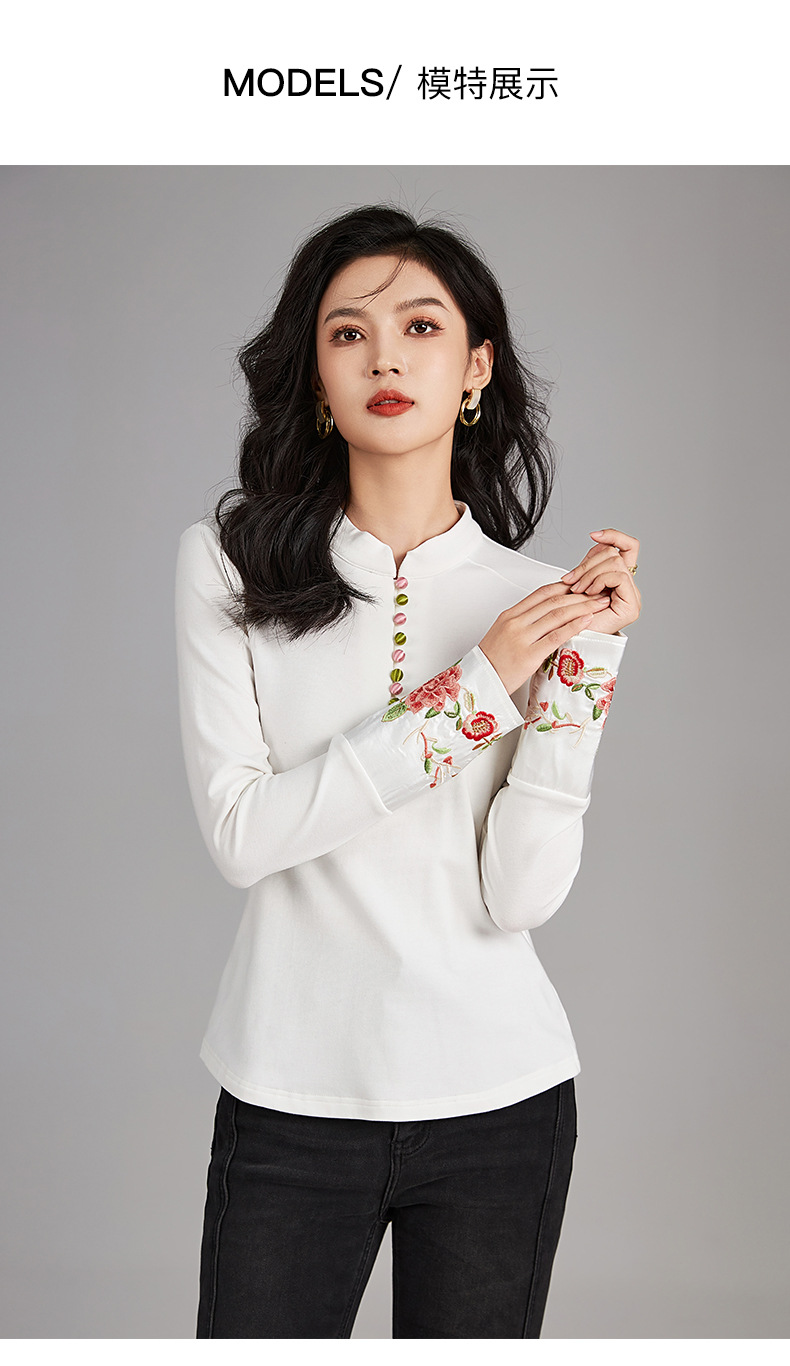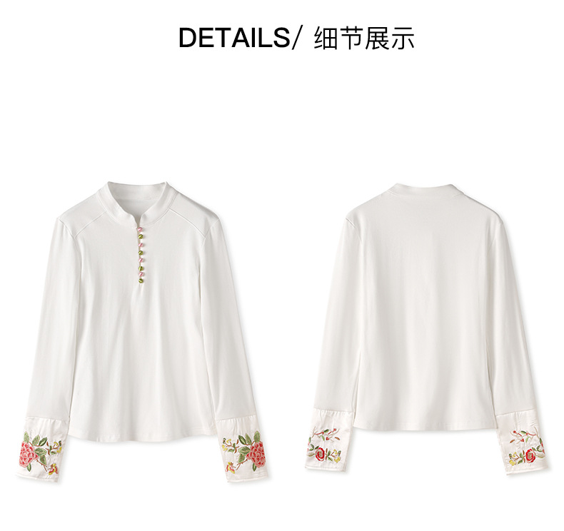 国风重工品质刺绣百搭修身T恤,女装时髦立领打底休闲上衣WLZD-2325503