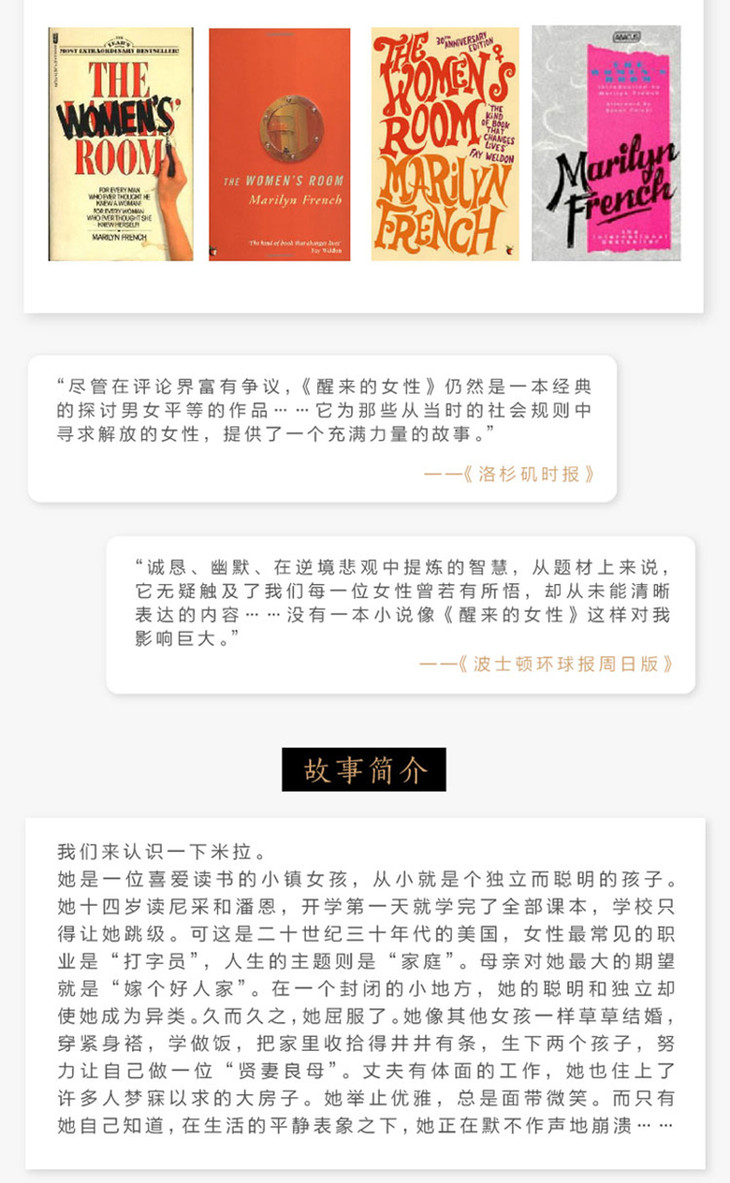 玛丽莲·弗伦奇(Marilyn French,1929~2009年),出生于布鲁克林,是一位工程师和百货商店店员的女儿。她从小热爱写作,十岁便开始创作诗歌和短篇小说。1950年,在霍夫斯特拉大学就读期间,玛丽莲结婚,开始兼职打工以支援丈夫就读法学院。受波伏瓦《第二性》影响,玛丽莲一直坚持创作,希望成为一名作家。她完成了在霍夫斯特拉大学的学业,获得哲学和英语文学学士学位以及英语硕士学位,成为一名英语老师。1964年,她考入哈佛大学,由于丈夫对其写作事业的反对,两人于1967年离婚。玛丽莲于1972年获得博士学位,并于1977年出版《醒来的女性》一书,一举成名。尽管由于暴露了很多尖锐的社会问题和性别歧视问题引发舆论争议,但本书仍在quanqiu销出2000多万册,出版22种语言版本,成为现象级的话题之作。有读者表示,这本书中所写的,就是当时女性*真实的生活。