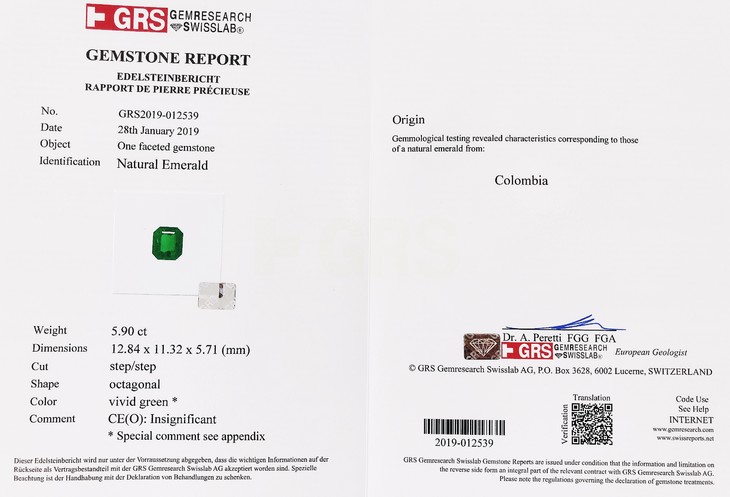 收藏级5.9克拉GRS证书哥伦比亚木佐绿祖母绿极微油