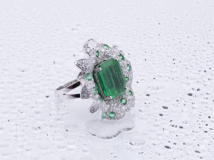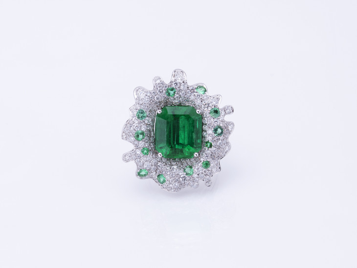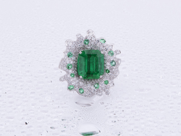 以罕见极微油木佐祖母绿为主石,为突出祖母绿切割之主石深遂浓郁的绿色,设计以飞溅开的水花为灵感,以大小不同的圆形切割钻石及祖母绿密镶于不规则的弧形白金表面,凝固了一粒宝石掉入水中的瞬间,仿佛一件高速摄影作品,极具动感和艺术气息。为了充分利用主石之珍贵,我们将这件设计做成项链及戒指两用,18K白金项链上,镶嵌以6粒水滴形钻石,与吊坠之水花相呼应,耀眼夺目;大台面祖母绿与水花上的钻石,在变成戒指时绝对是手指上不容忽视的高贵存在。