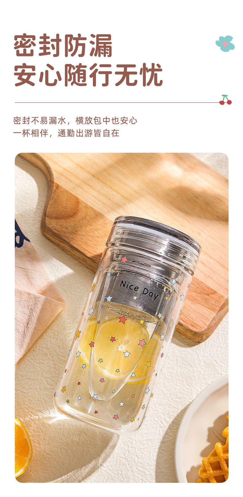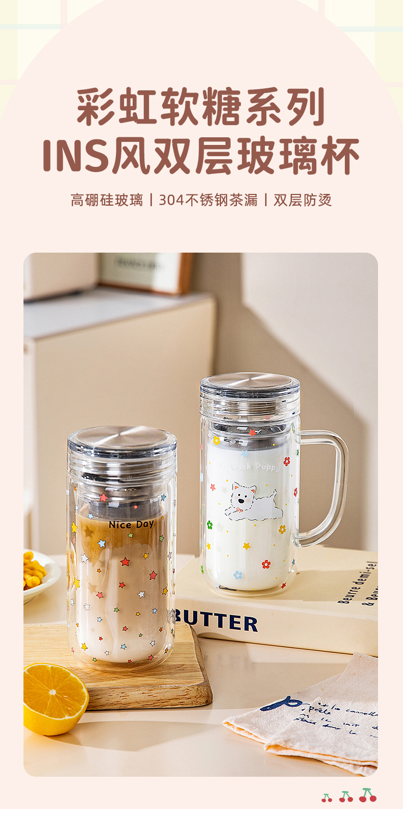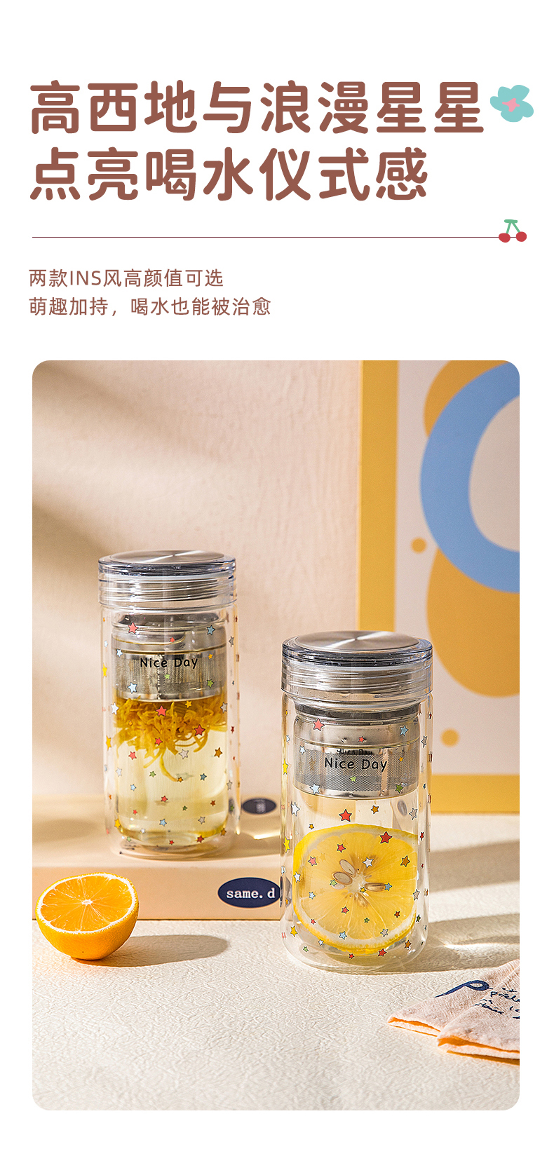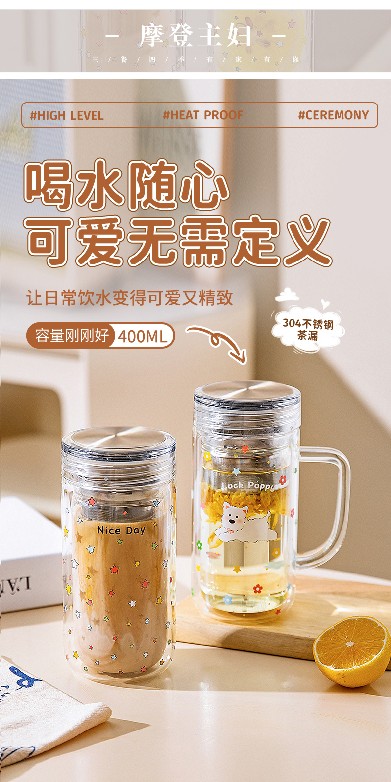 摩登主妇双层玻璃杯带盖咖啡杯子办公室水杯耐高温茶水分离泡茶杯