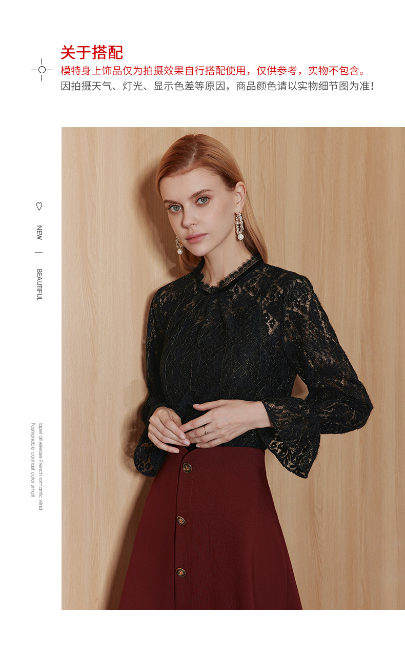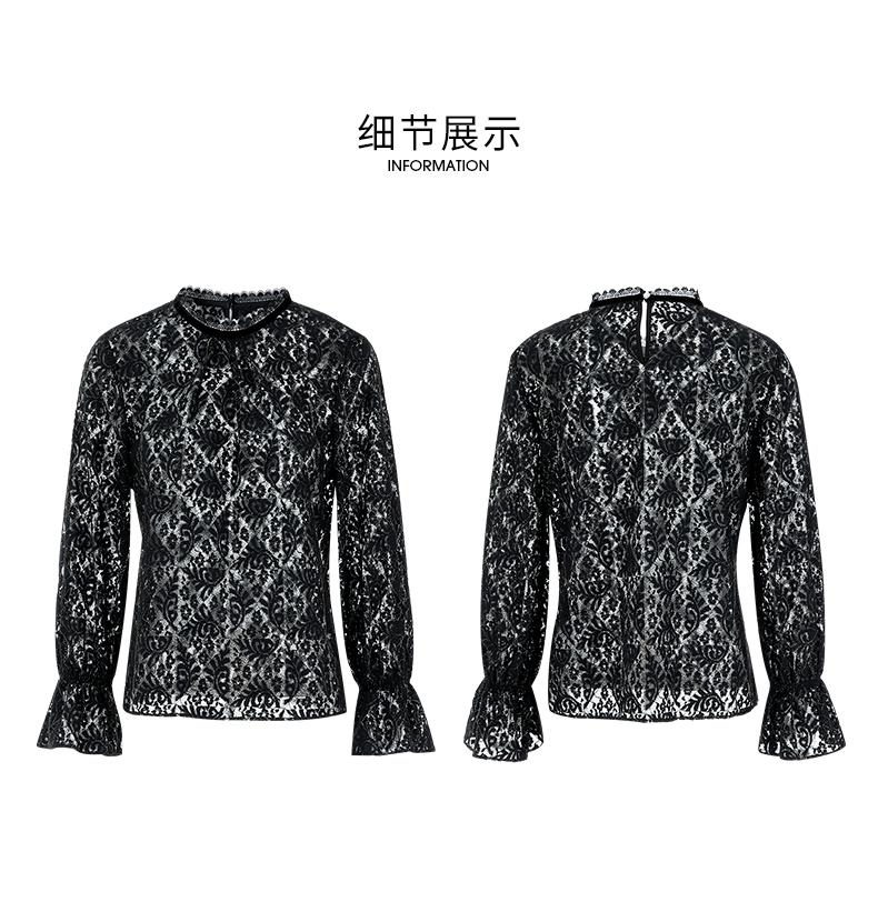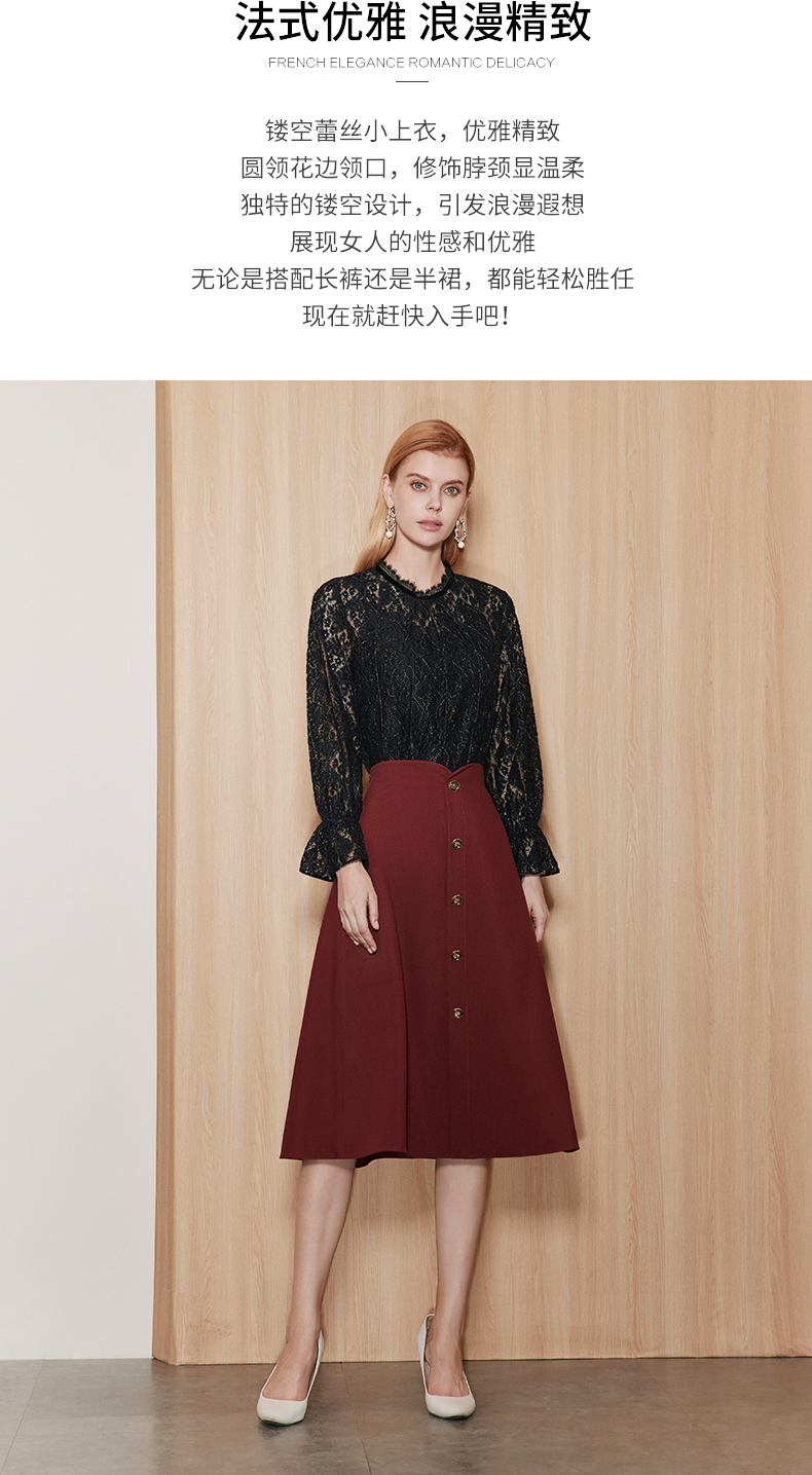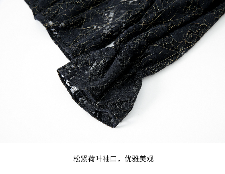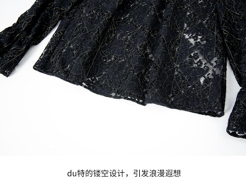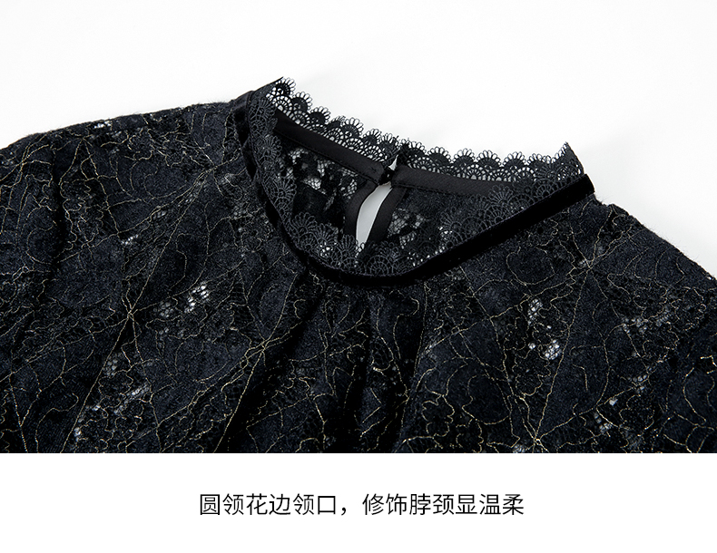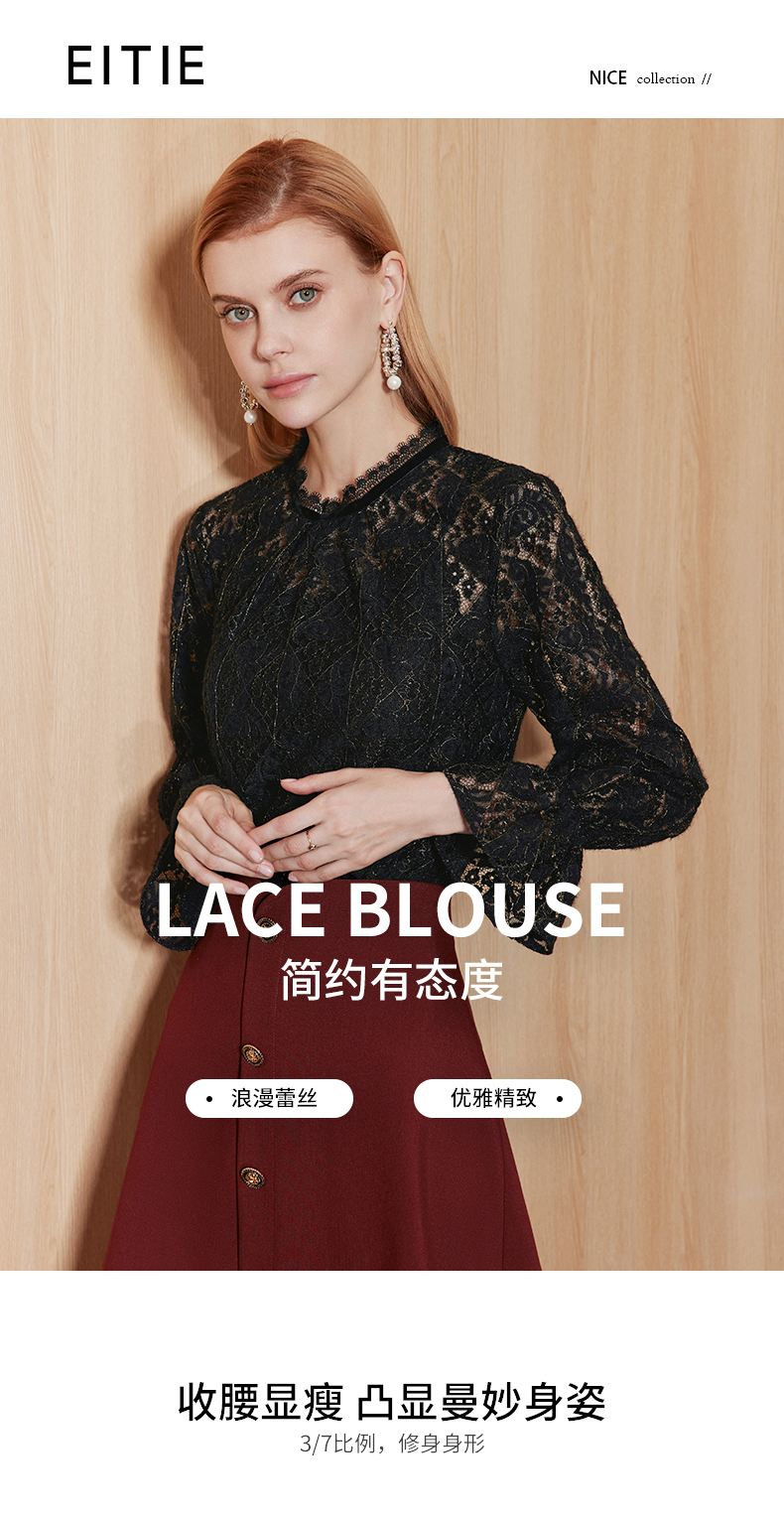 EITIE爱特爱宫廷风立领黑色蕾丝两件套直筒显瘦通勤上衣秋新款C13206