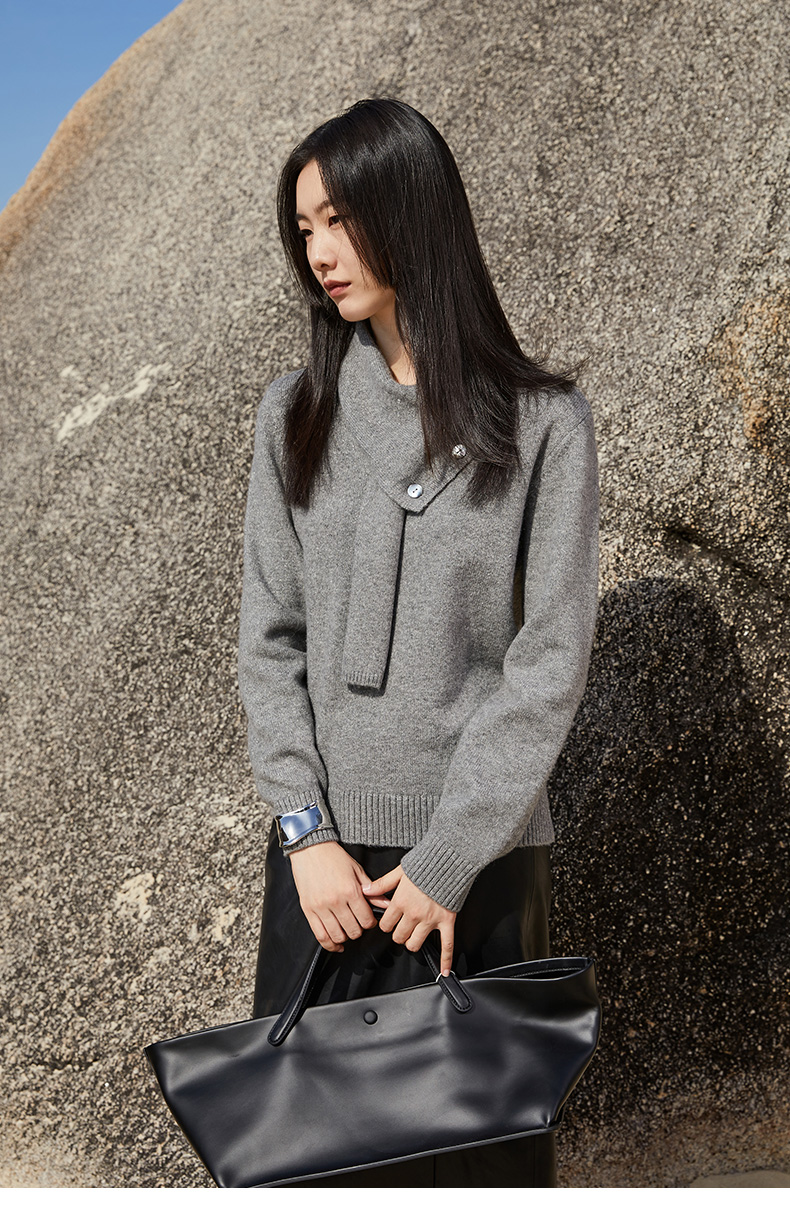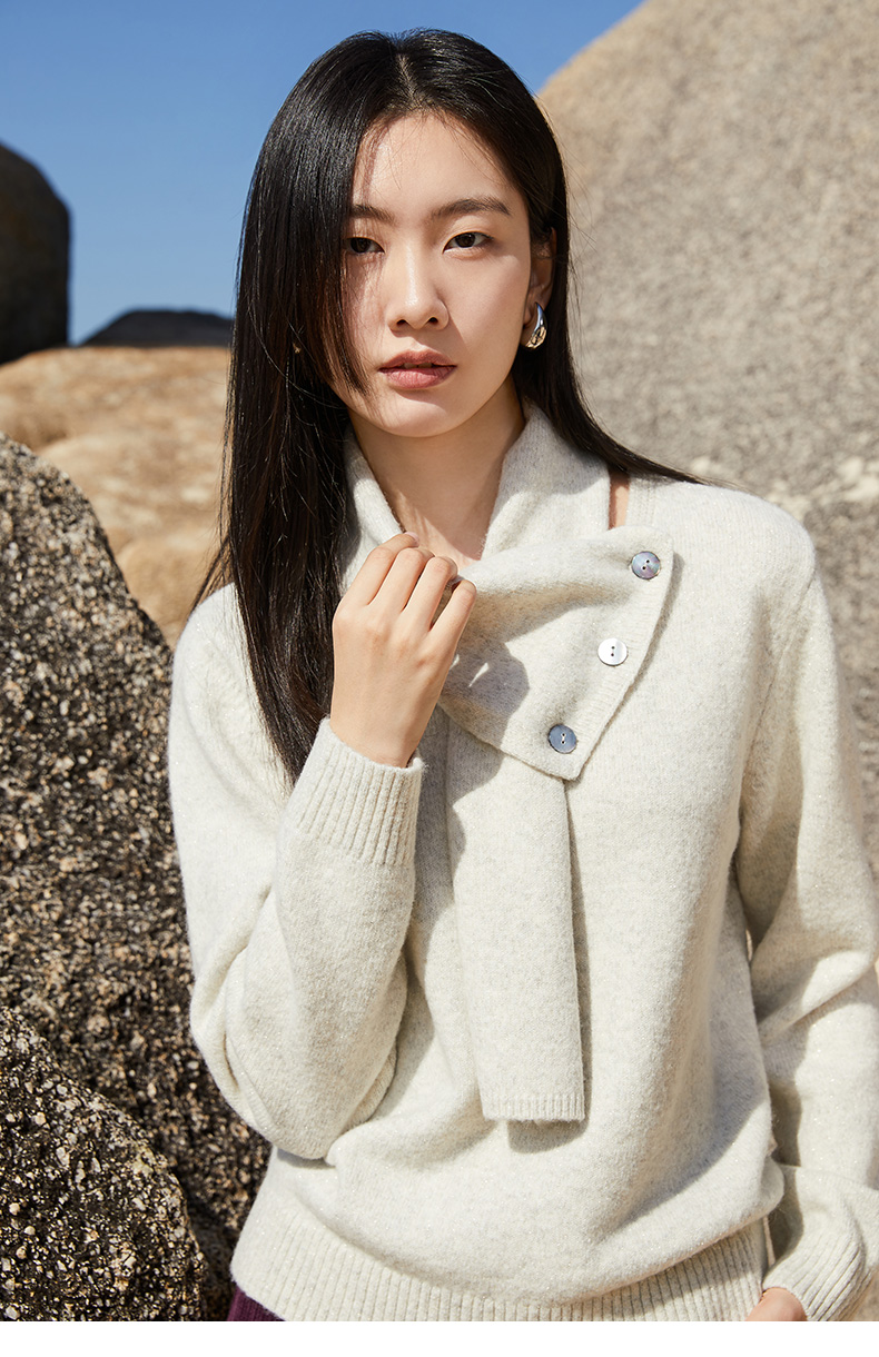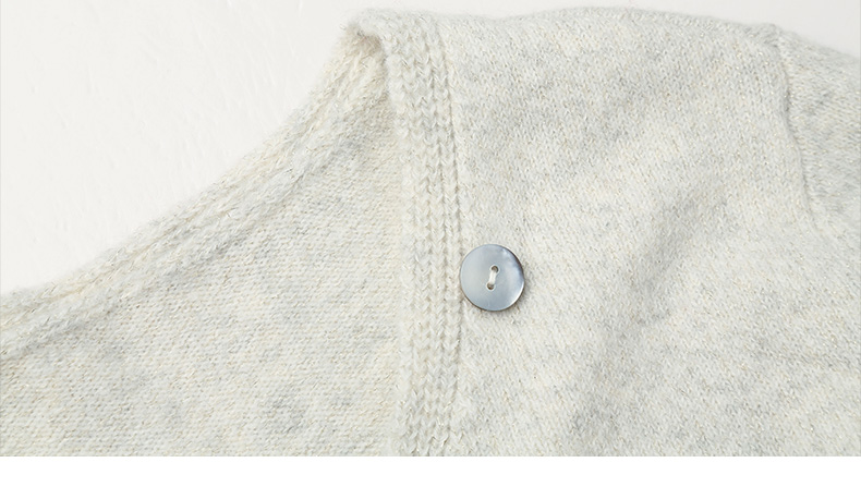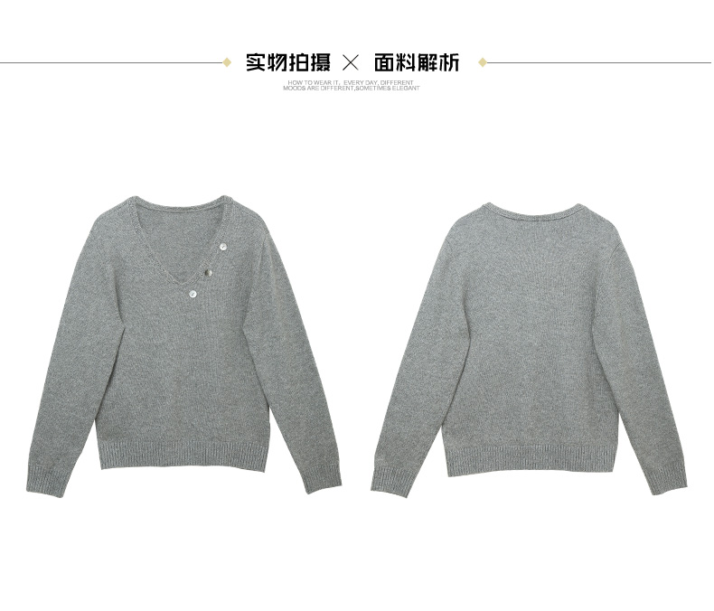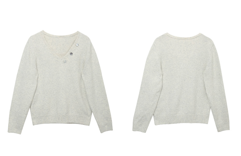 浅灰色 V 领不对称纽扣装饰针织衫 秋冬温柔风宽松显瘦长袖套头毛衣上衣