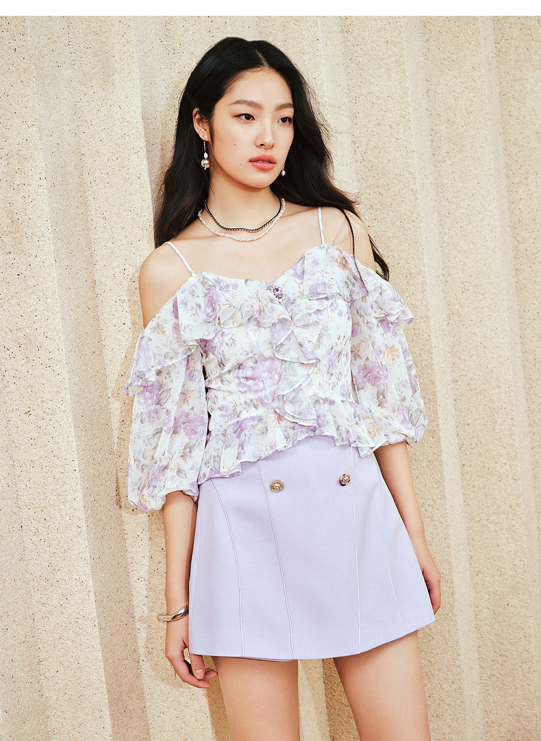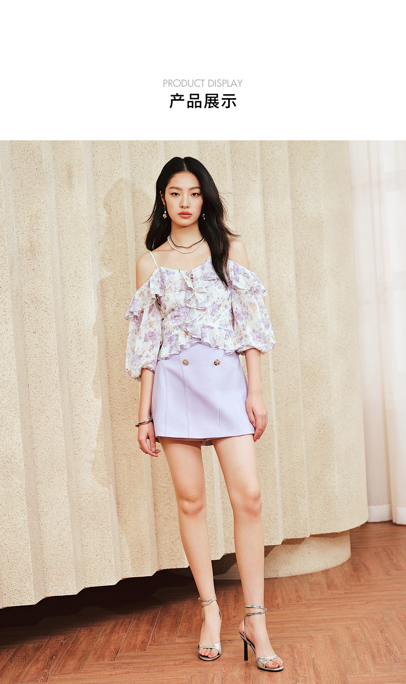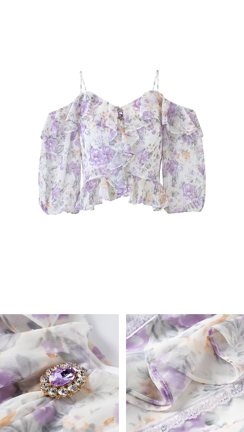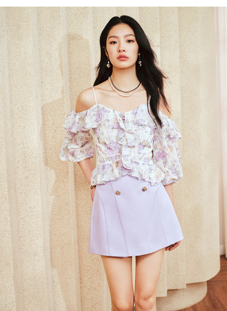 MAXRIENY仙美浪漫感吊带上衣一字肩荷叶边2024夏季新款修身显瘦女(货号:MS85TP048)