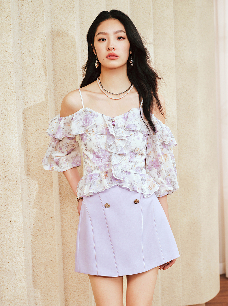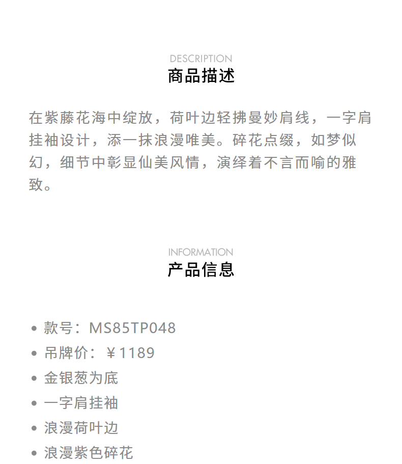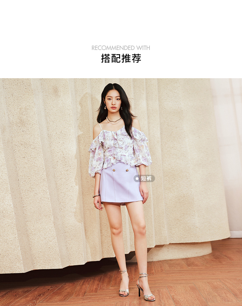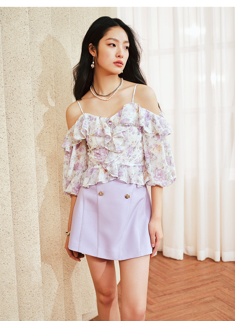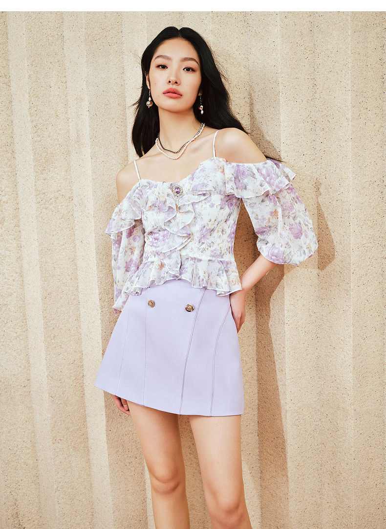 MAXRIENY仙美浪漫感吊带上衣一字肩荷叶边2024夏季新款修身显瘦女(货号:MS85TP048)