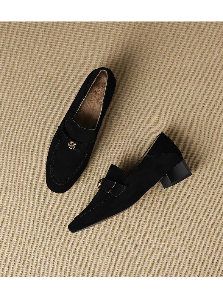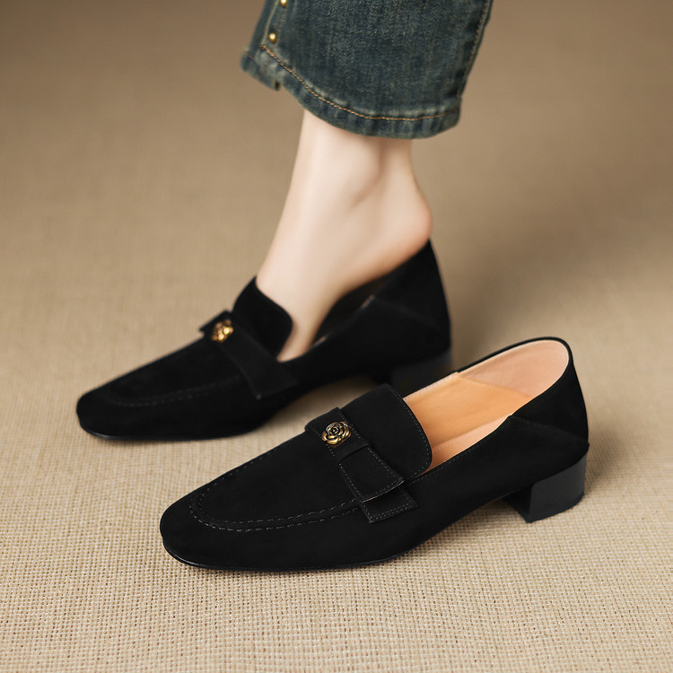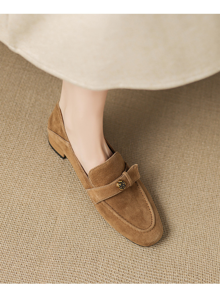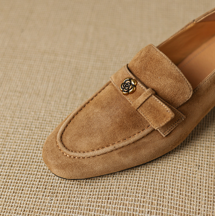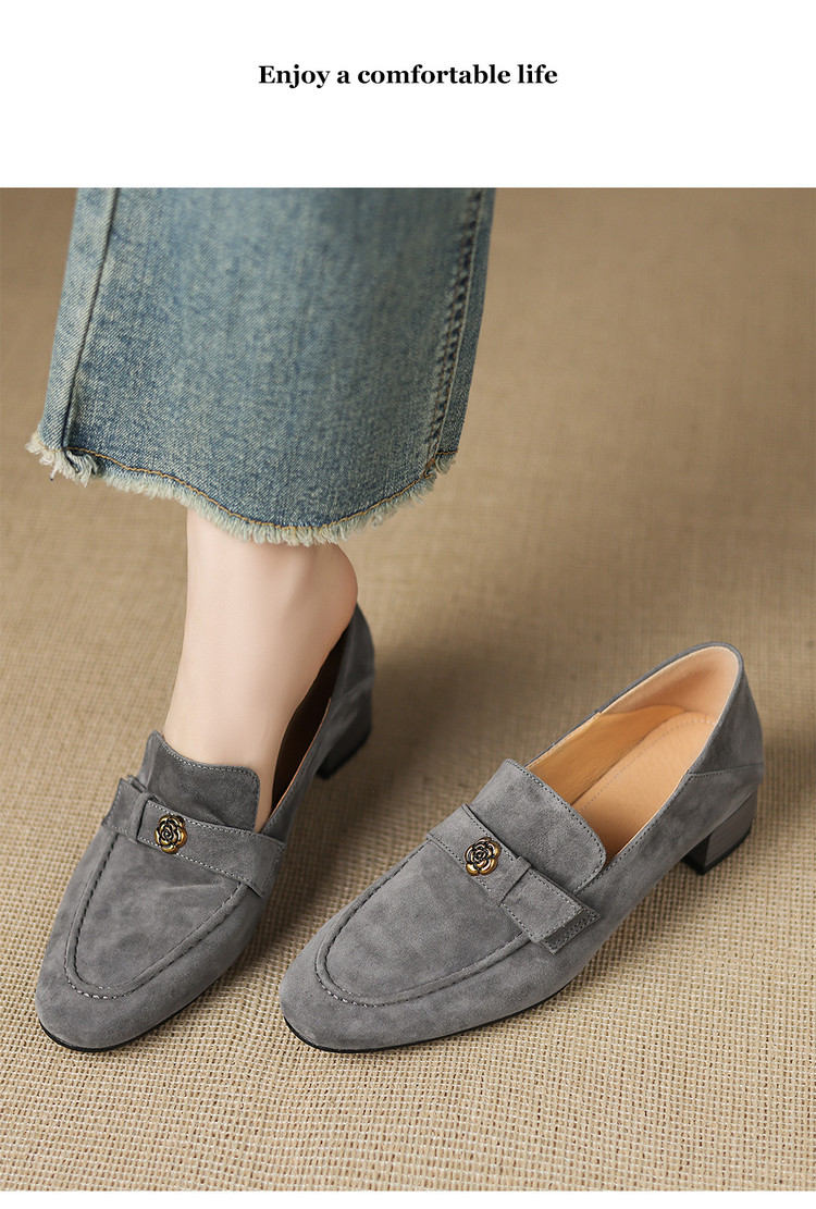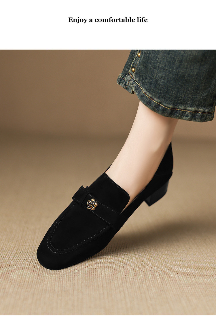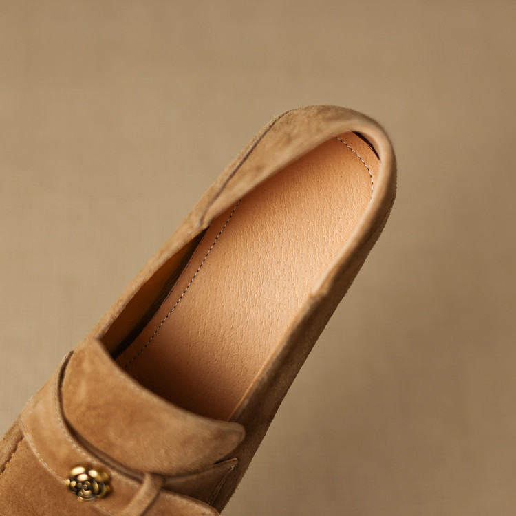 【预售5天】羊皮版~复古法式美拉德山茶花乐福鞋女一脚蹬粗跟浅口单鞋小皮鞋NGMZR&72-237