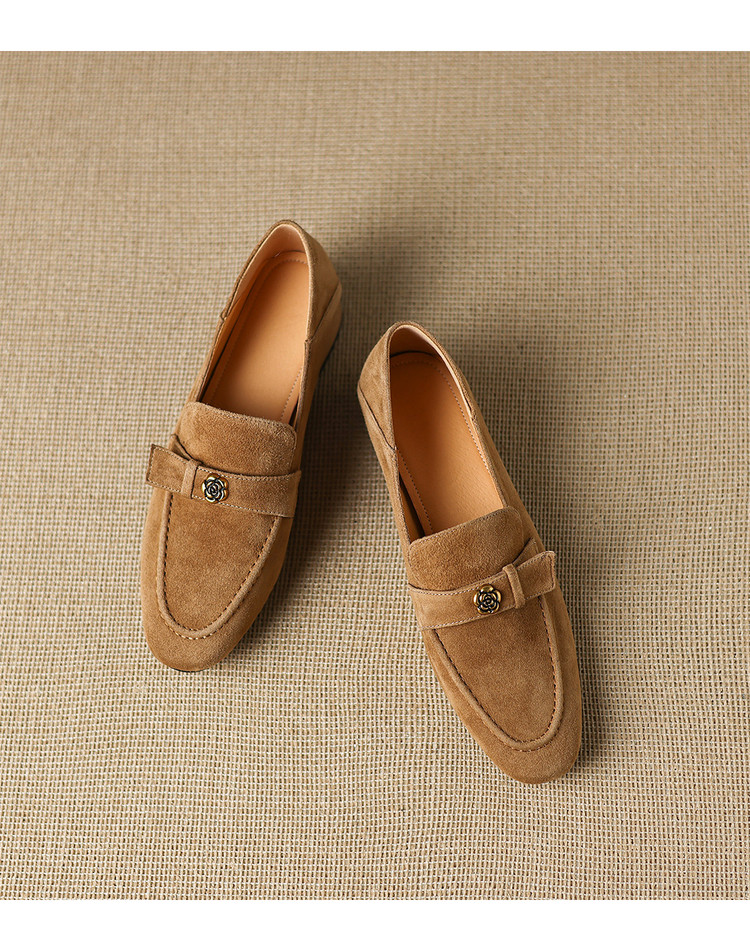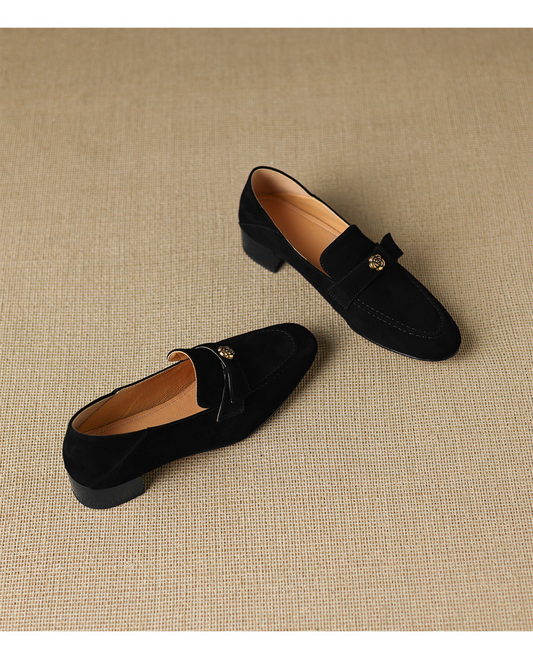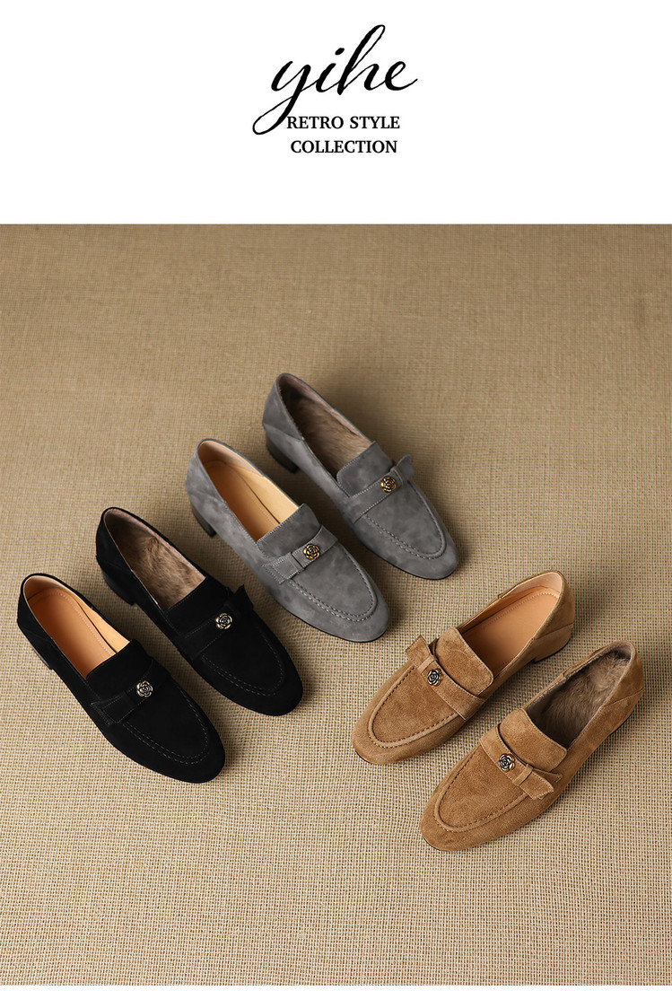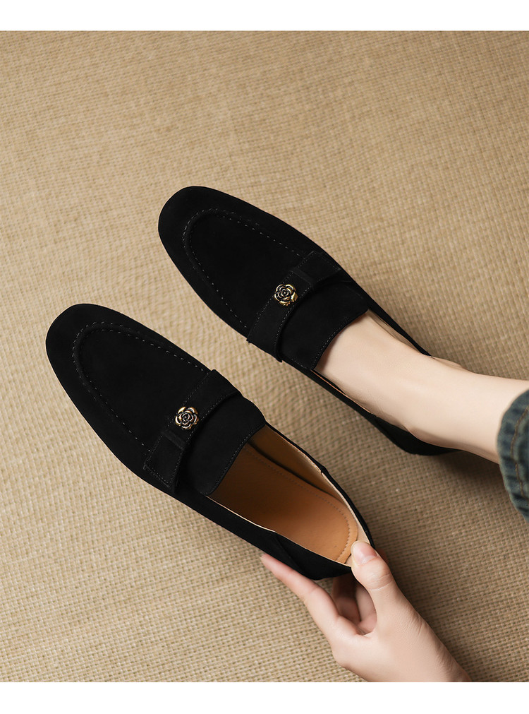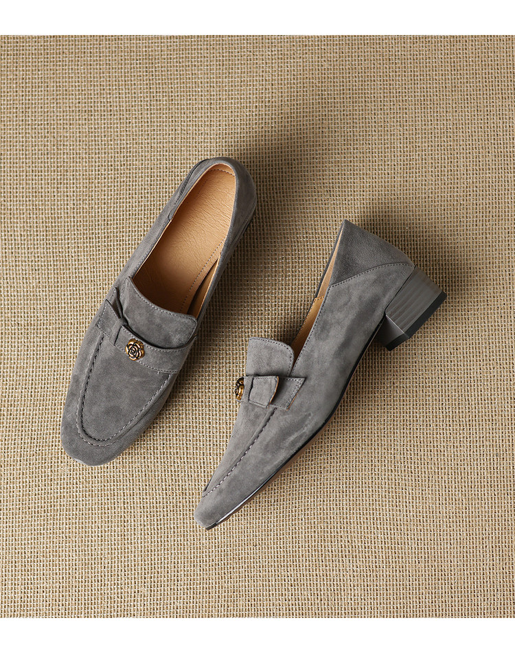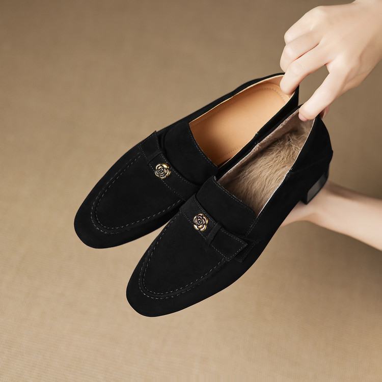 【预售5天】羊皮版~复古法式美拉德山茶花乐福鞋女一脚蹬粗跟浅口单鞋小皮鞋NGMZR&72-237