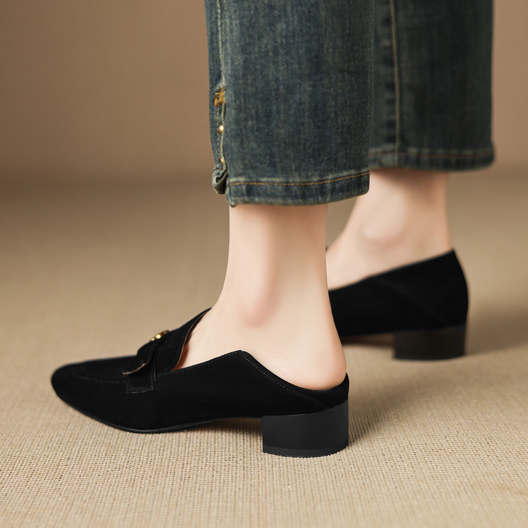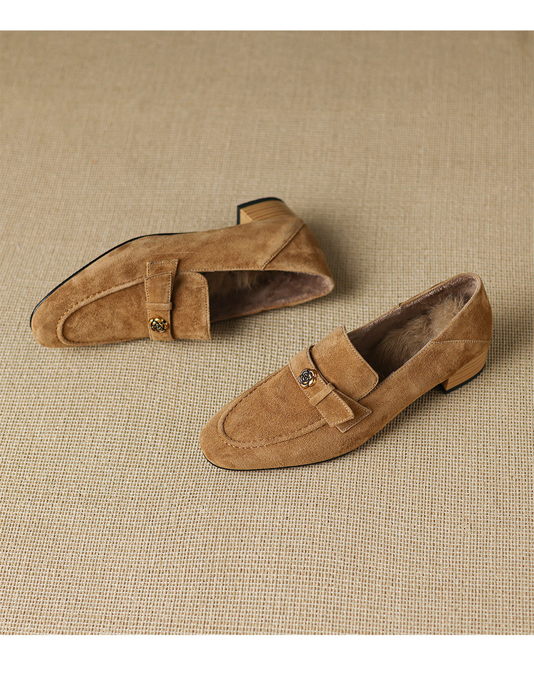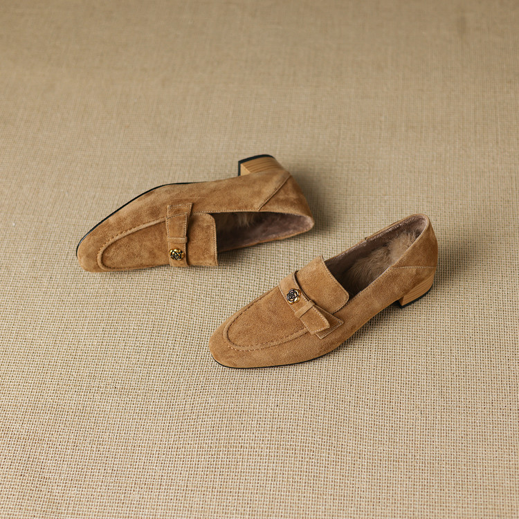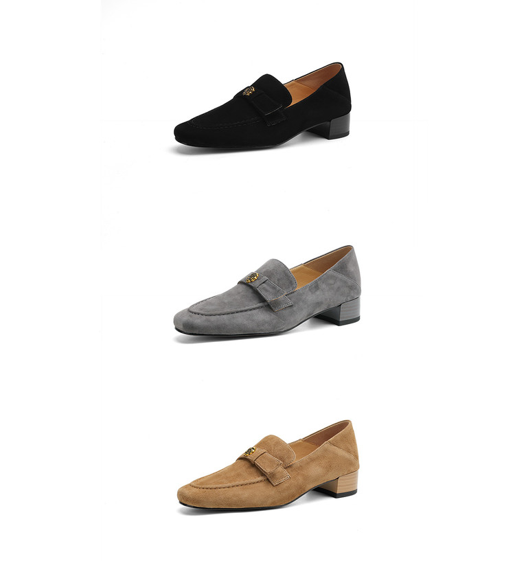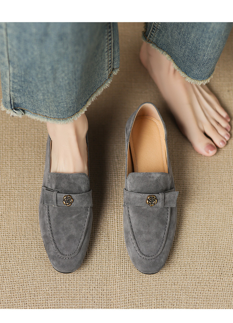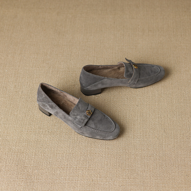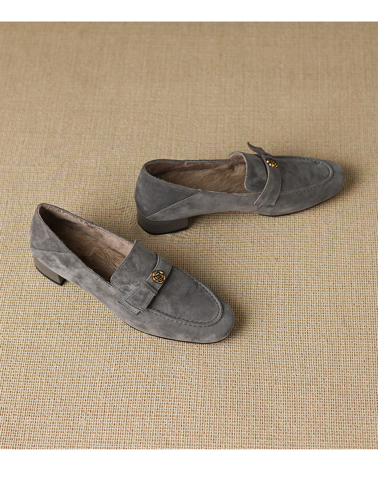 【预售5天】羊皮版~复古法式美拉德山茶花乐福鞋女一脚蹬粗跟浅口单鞋小皮鞋NGMZR&72-237