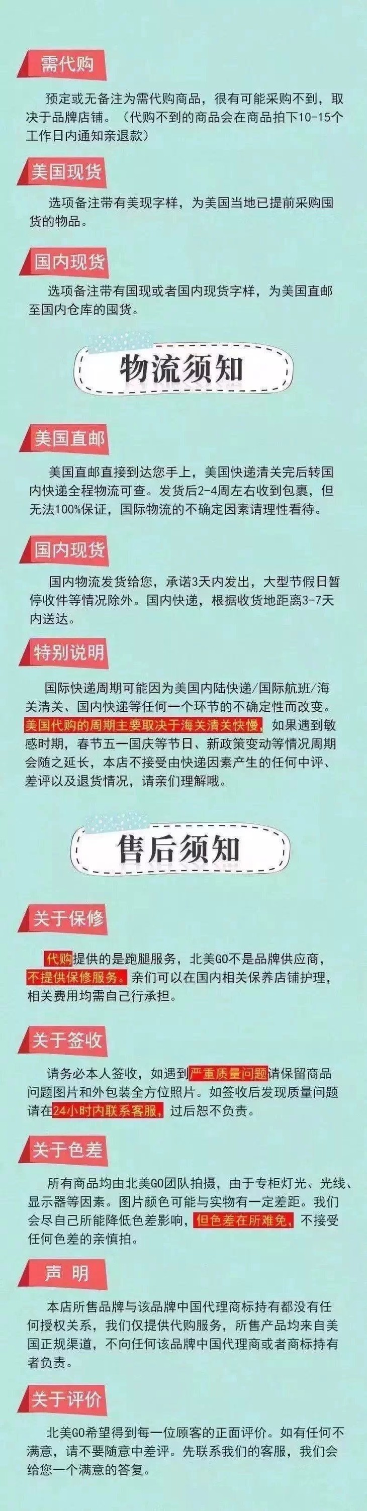 - 北美GO是一家专业从事海外代购和跨境电商店铺,保证代购商品均为国外正规网站、超市、专卖店采购后寄到客户指定地址,无中文标签。本店只提供海外代买服务,不承担商品的具体功效承诺及异议。