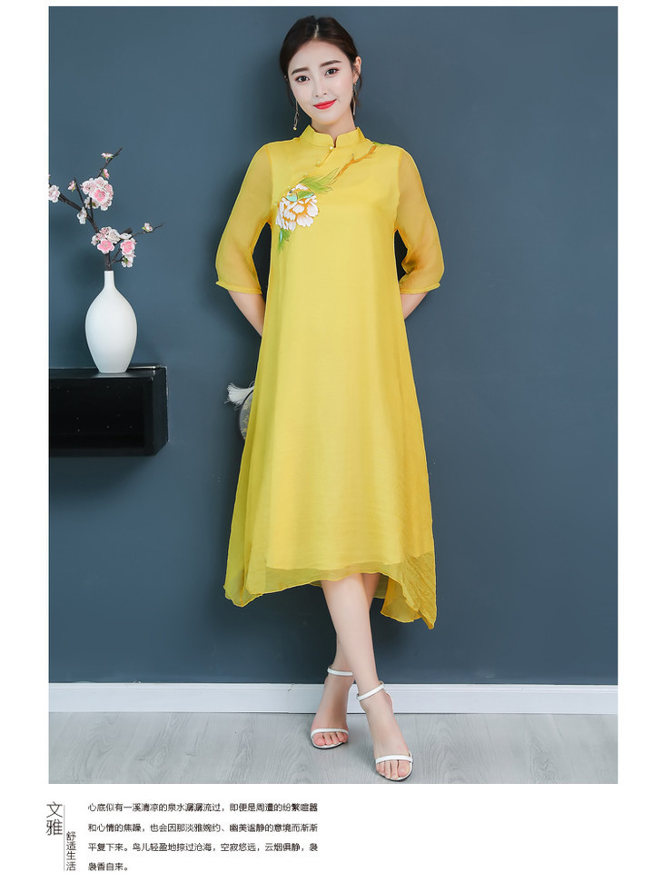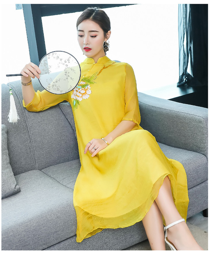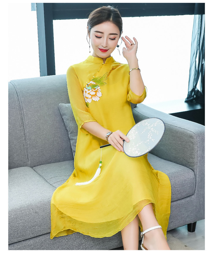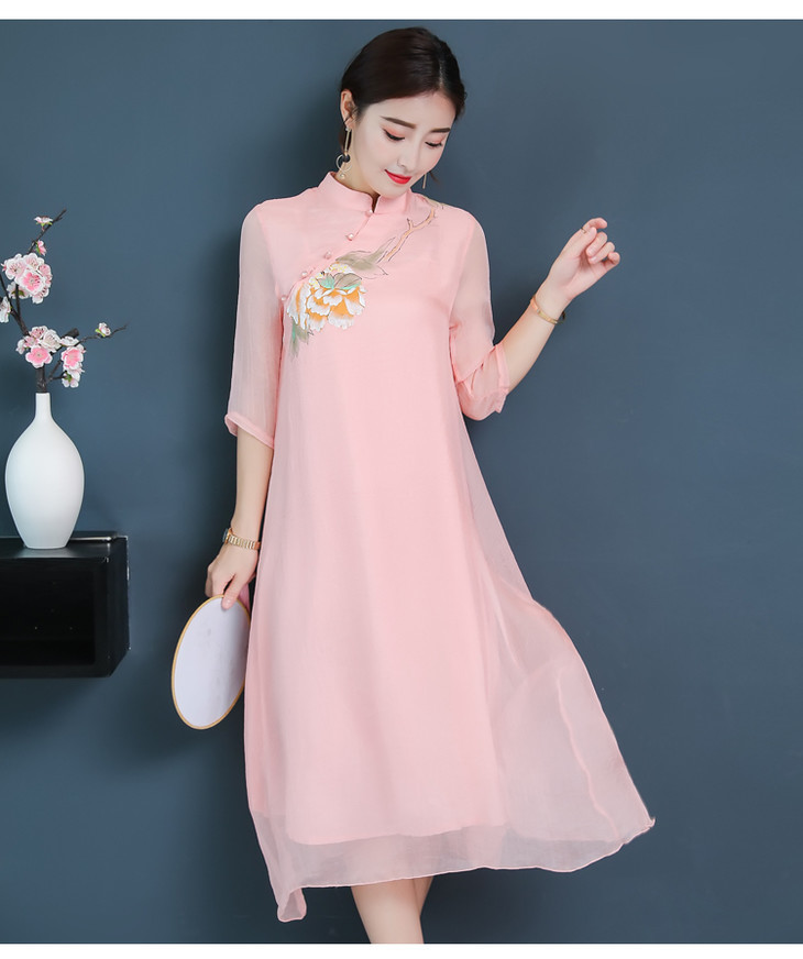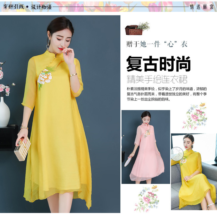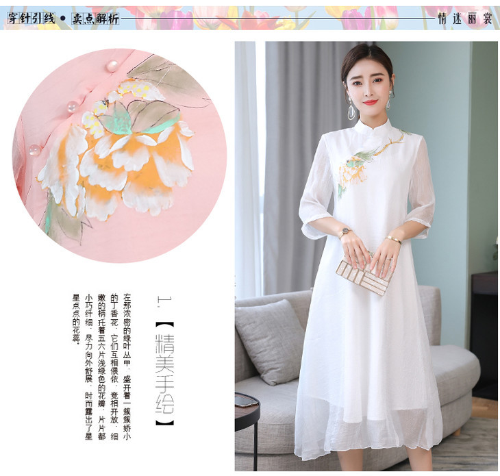 F 8021 改良旗袍之逐晴光 手绘牡丹雪纺连衣裙