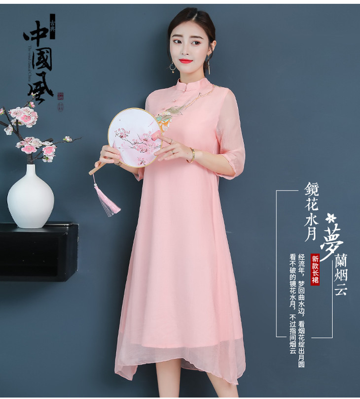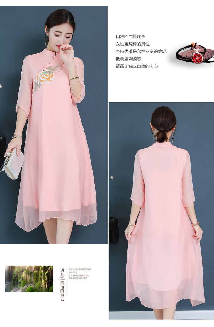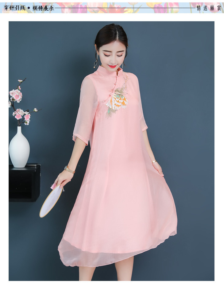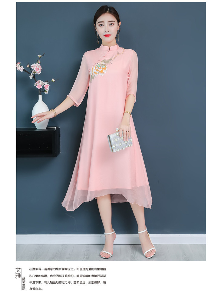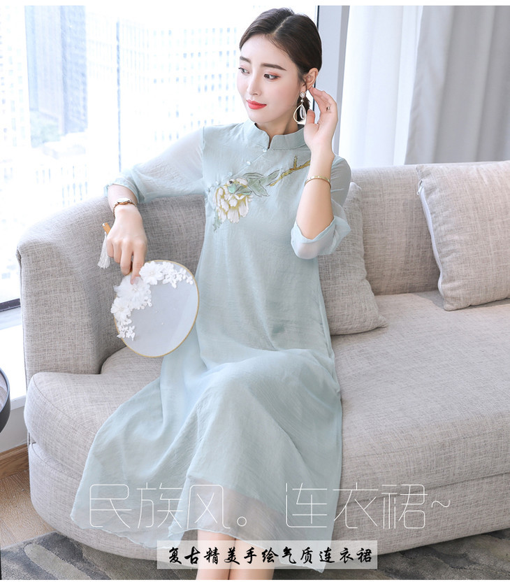 F 8021 改良旗袍之逐晴光 手绘牡丹雪纺连衣裙