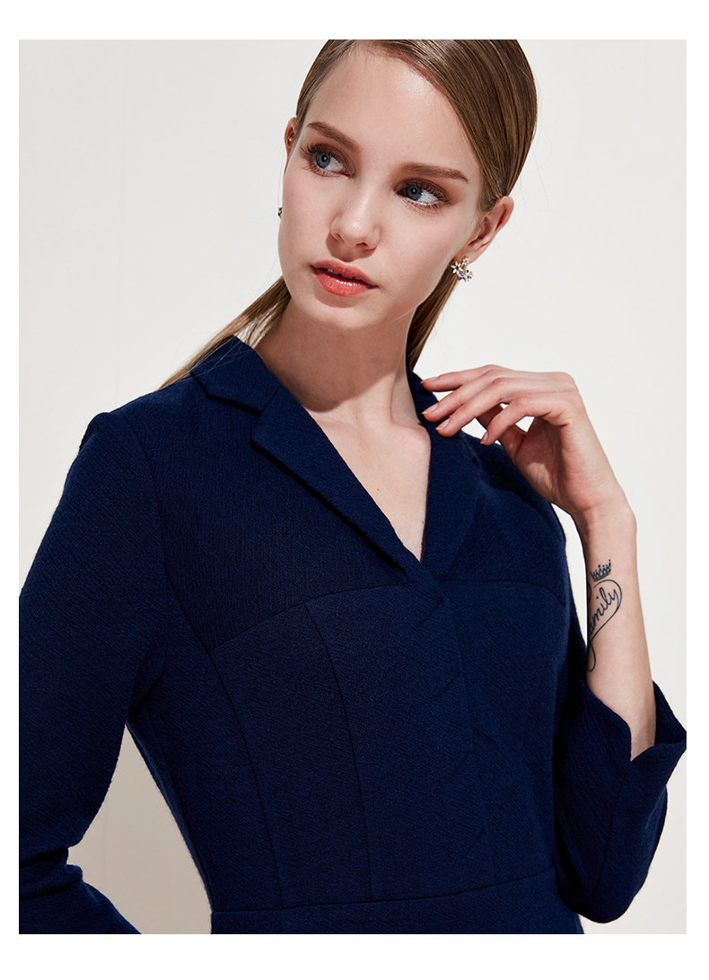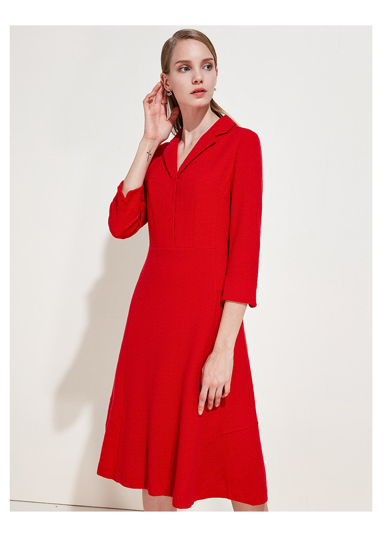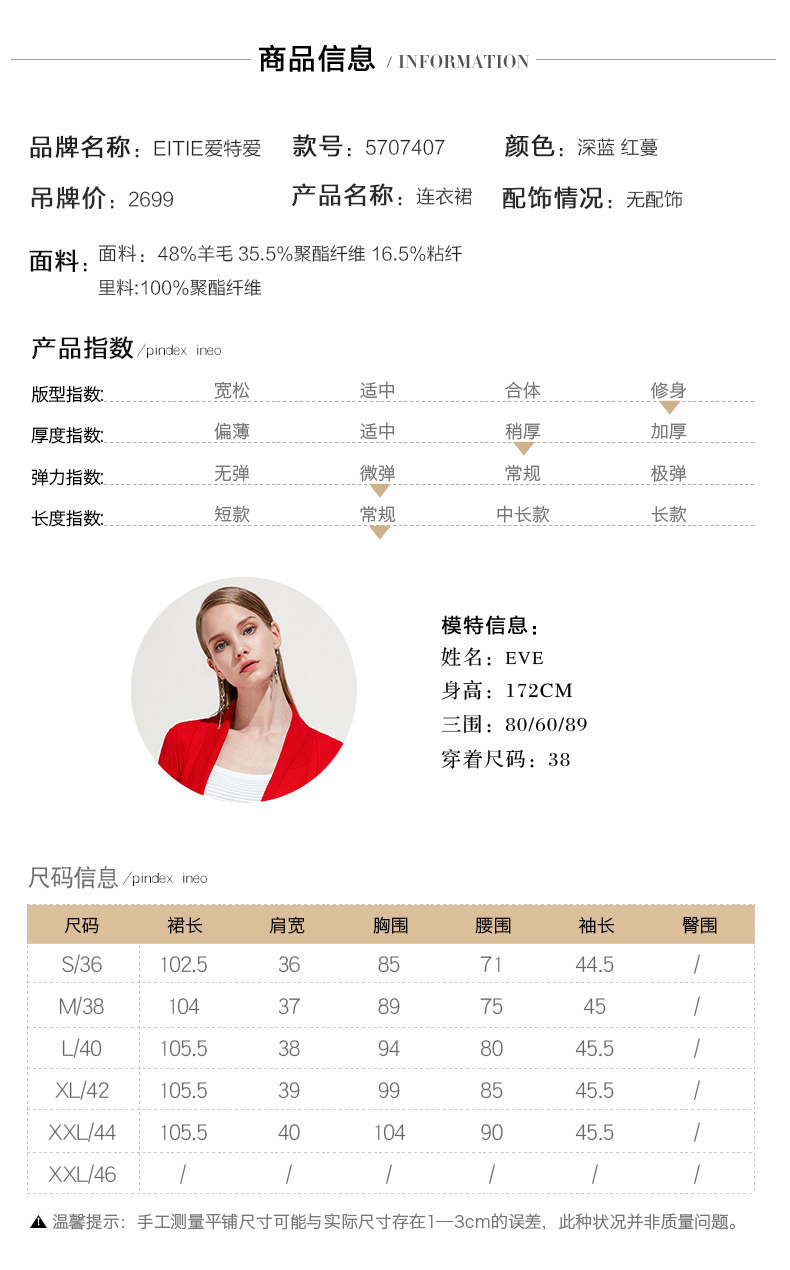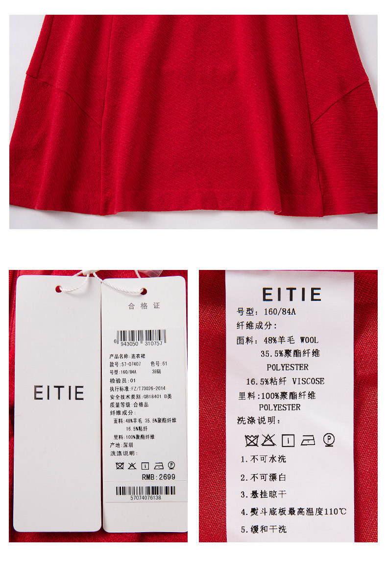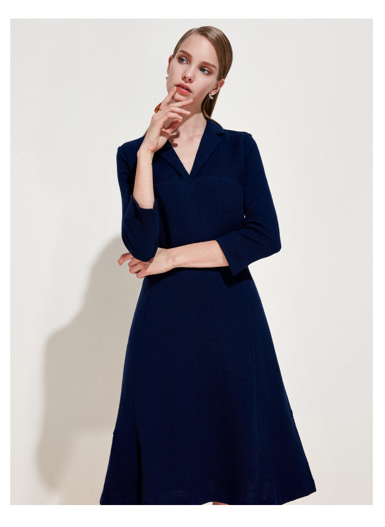 EITIE爱特爱品牌女装春季新款时尚气质V领中腰羊毛连衣裙中裙5707407