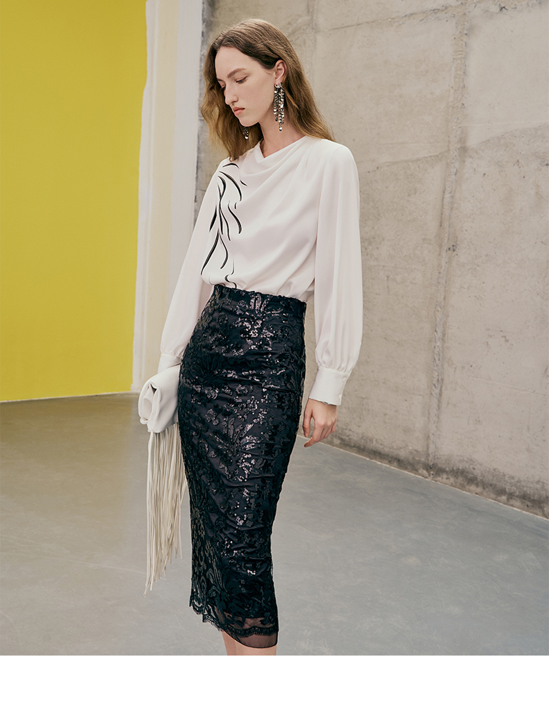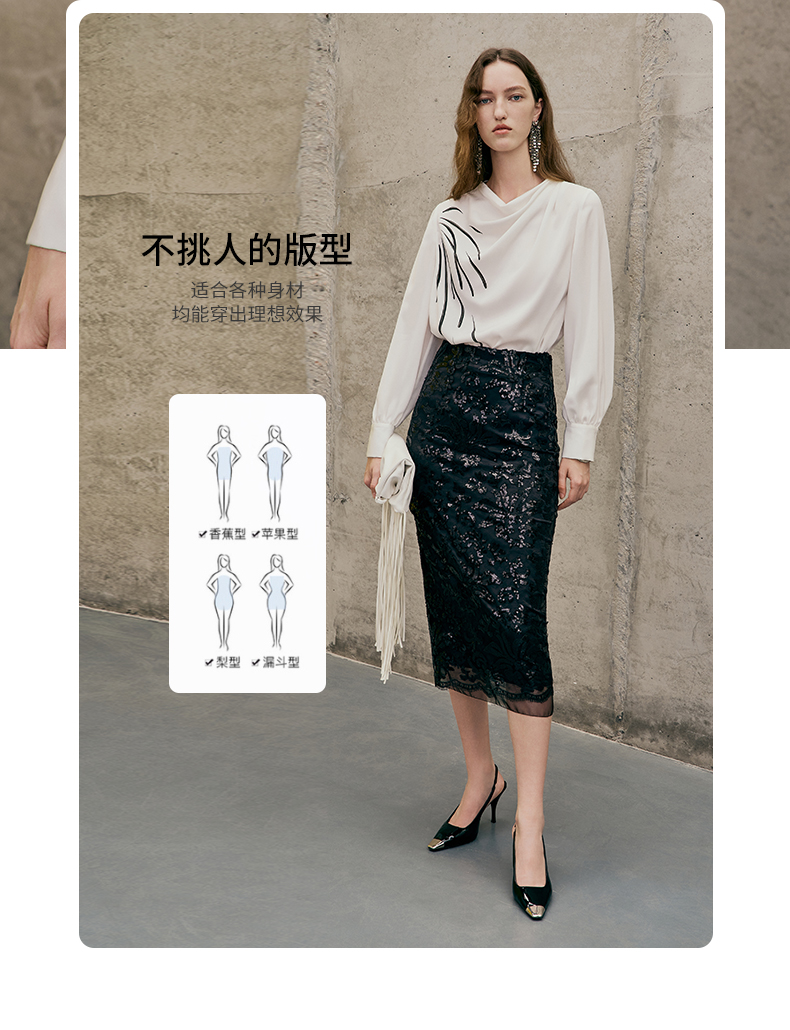 EITIE爱特爱网纱拼接半高领气质黑色针织衫灯笼袖修身秋新款C2201022