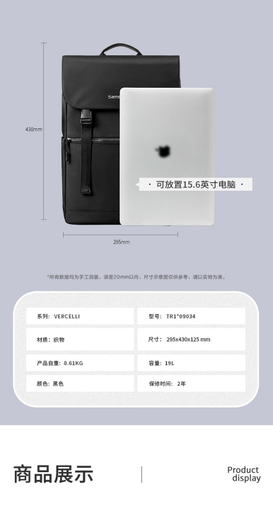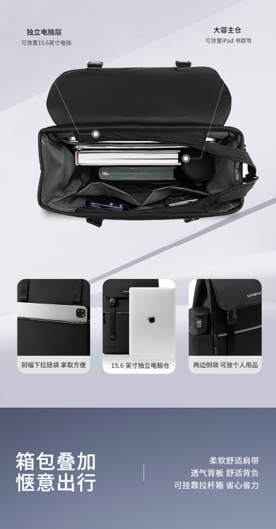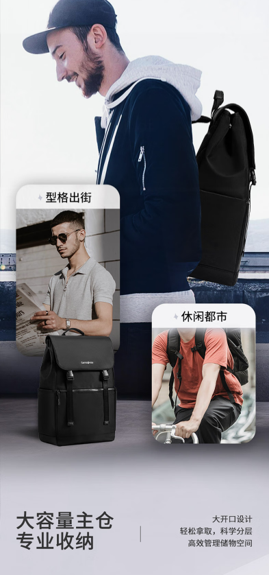 新秀丽(Samsonite)男士大学生双肩笔记本电脑包翻盖设计通勤出差轻便旅行大容量 TR1*09034黑色
