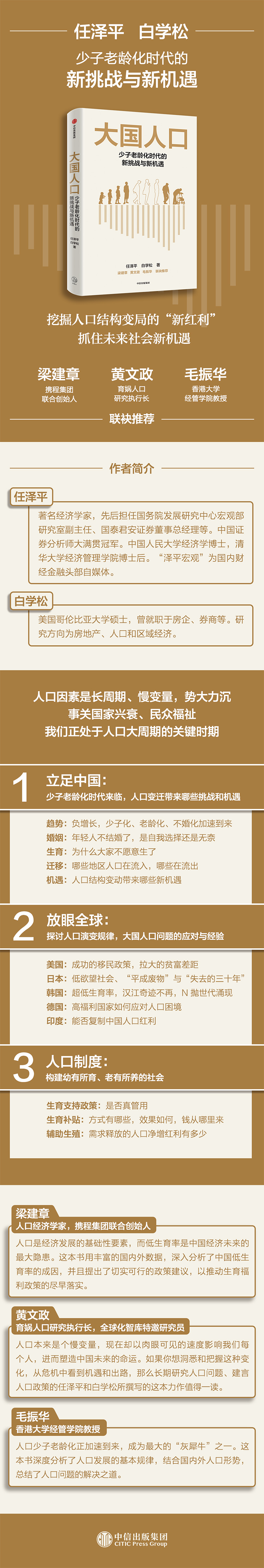 人口本来是个慢变量,现在却以肉眼可见的速度影响我们每个人,进而塑造中国未来的命运。如果你想洞悉和把握这种变化,从危机中看到机遇和出路,那么长期研究人口问题、建言人口政策的任泽平和白学松所撰写的这本力作值得一读。