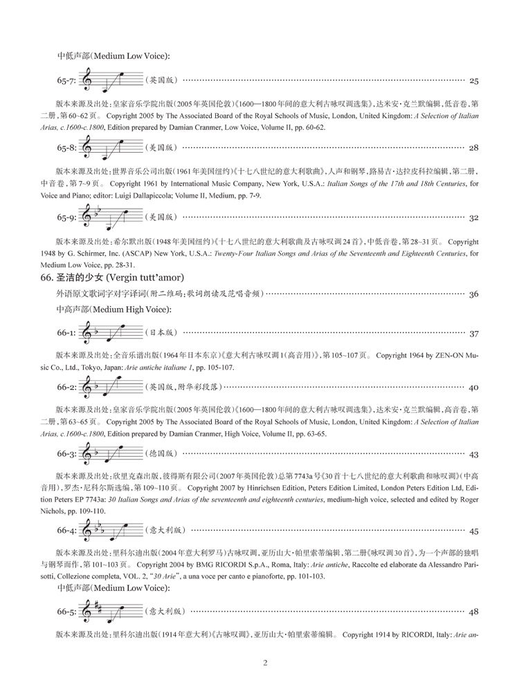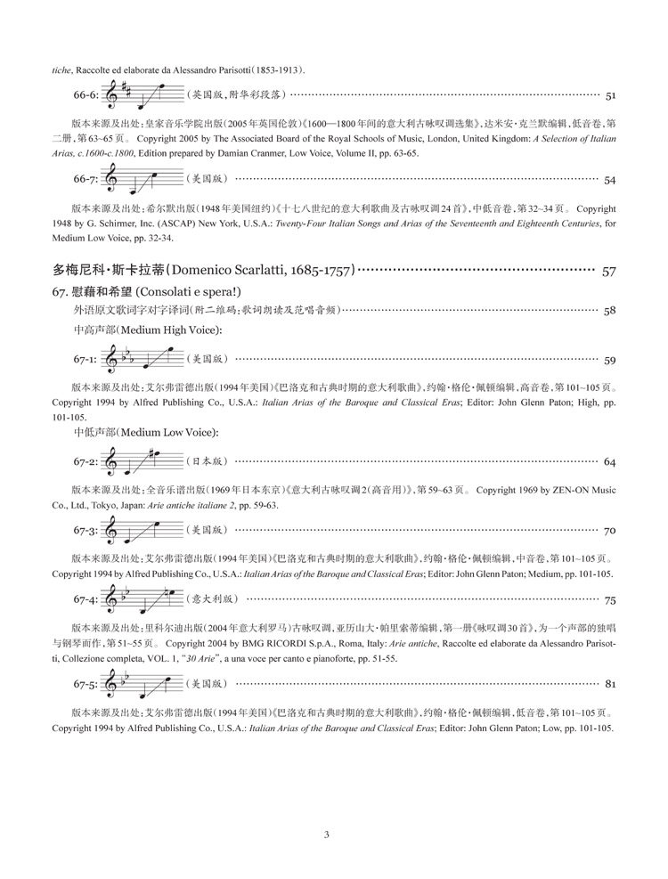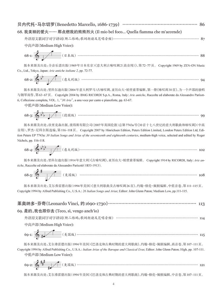 需要说明的是,国内以往选编的这个时期的曲目总量偏少且略显单调,随着国内声乐教学的不断的发展和进步,现今需要把更多相关时期的作曲家的优秀作品介绍到国内来。本套乐谱除了收编有国内声乐界较为熟悉的一些曲目,另外还有一些曲目是国内全新出版,以起到推陈出新、丰富教学曲目的作用。
