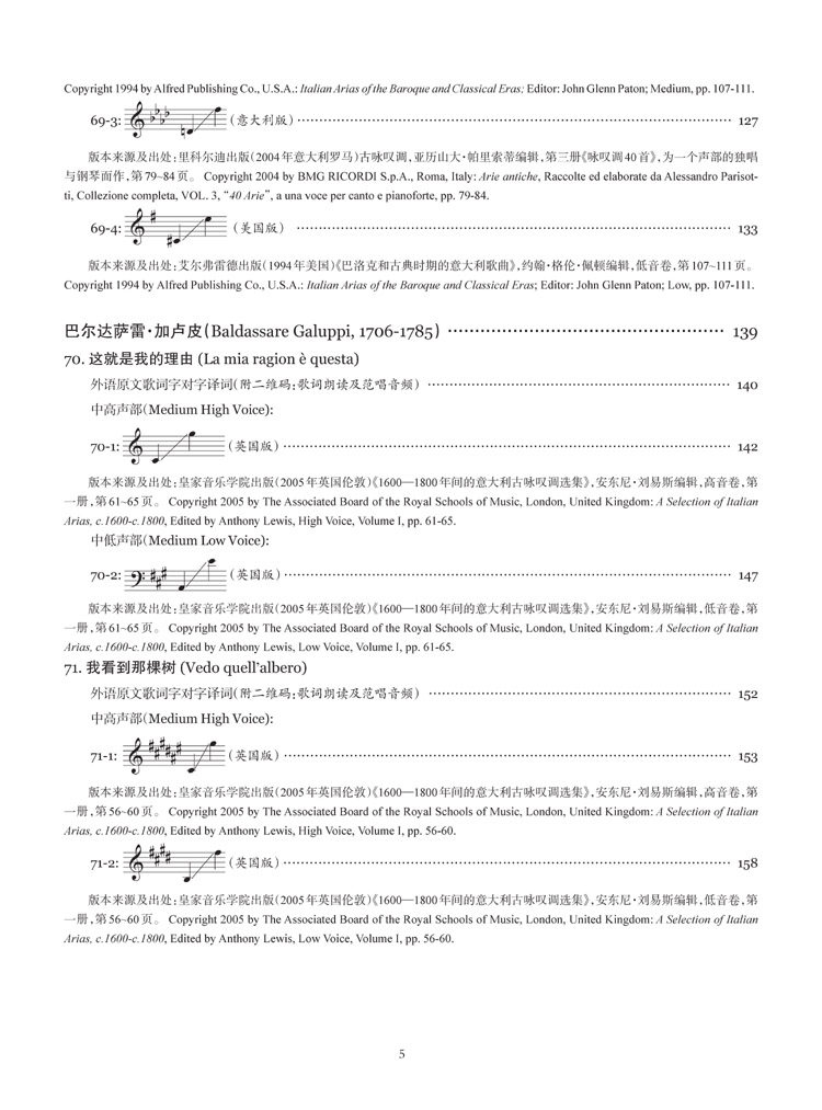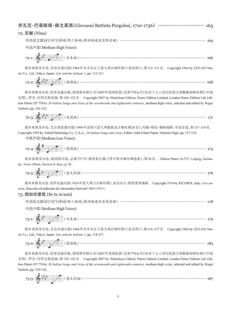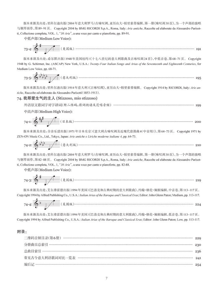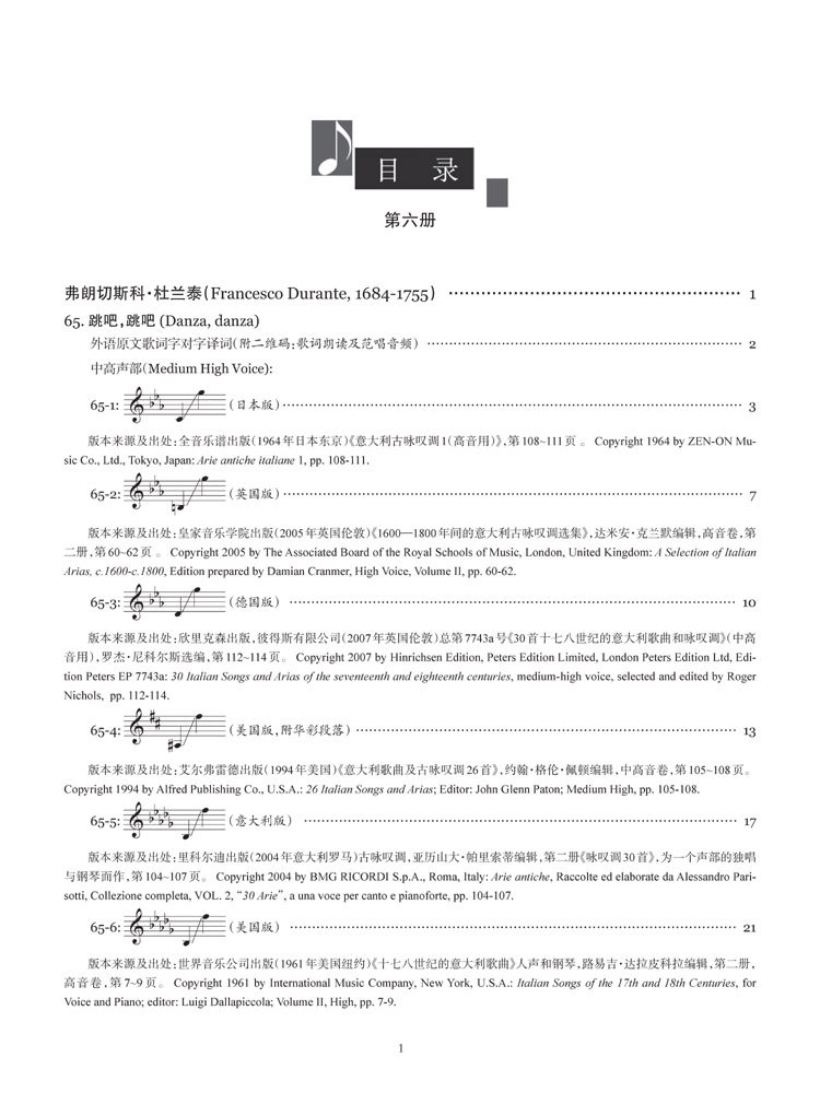 第六册主要是巴洛克中后期的意大利声乐独唱作品。本册乐谱分别包括杜兰泰(Francesco Durante, 1684-1755)、多梅尼科·斯卡拉蒂(Domenico Scarlatti, 1685-1757)、马尔切罗(Benedetto Marcello, 1686-1739)、芬奇(Leonardo Vinci, 1690-1730)、加卢皮(Baldassare Galuppi, 1706-1785)、佩戈莱西(Giovanni Battista Pergolesi, 1710-1736)等6位作曲家的声乐独唱曲10首,例如那不勒斯乐派重要的作曲家杜兰泰的歌曲《圣洁的少女》以及那不勒斯乐派优秀的作曲家佩戈莱西的歌曲《假如你爱我》等名曲,另有诸多全新曲目。(鉴于篇幅有限,本文中提及的歌曲都只列出中文歌名,其对应的外语原文曲名,请各位亲对照您手中的出版物的目录查找及对照,抱歉哟!)
