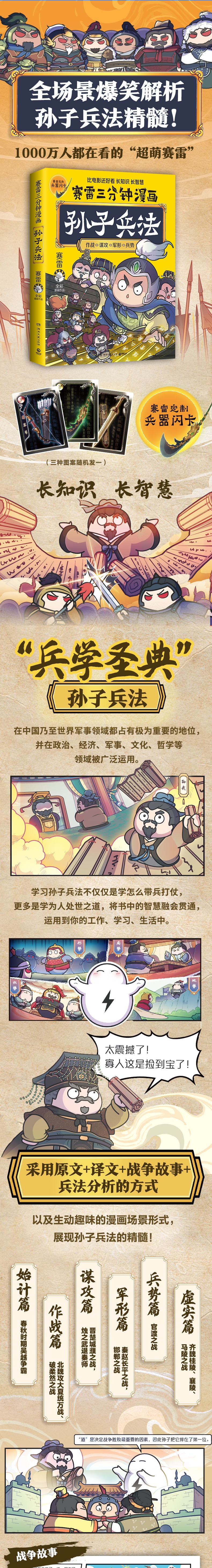 《赛雷三分钟漫画孙子兵法》采用原文+译文+战争故事+兵法分析的方式,以及生动趣味的漫画场景形式,展现了孙子兵法的精彩之处,让读者读懂孙子兵法的内容,更理解这本典名著的智慧哲理,领略传统文化的魅力,并在生活中学有所用。