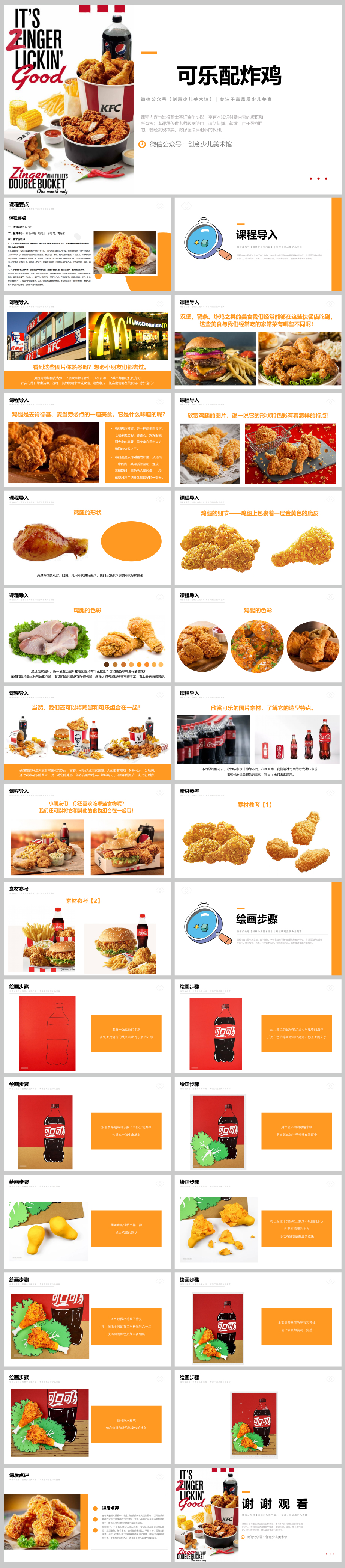 6-8岁《可乐配炸鸡》以身边的美食为创作题材,运用生动有趣的方式创作美味的炸鸡与可乐,培养小朋友们从生活中发现美的能力,锻炼小朋友们的绘画能力和动手能力。