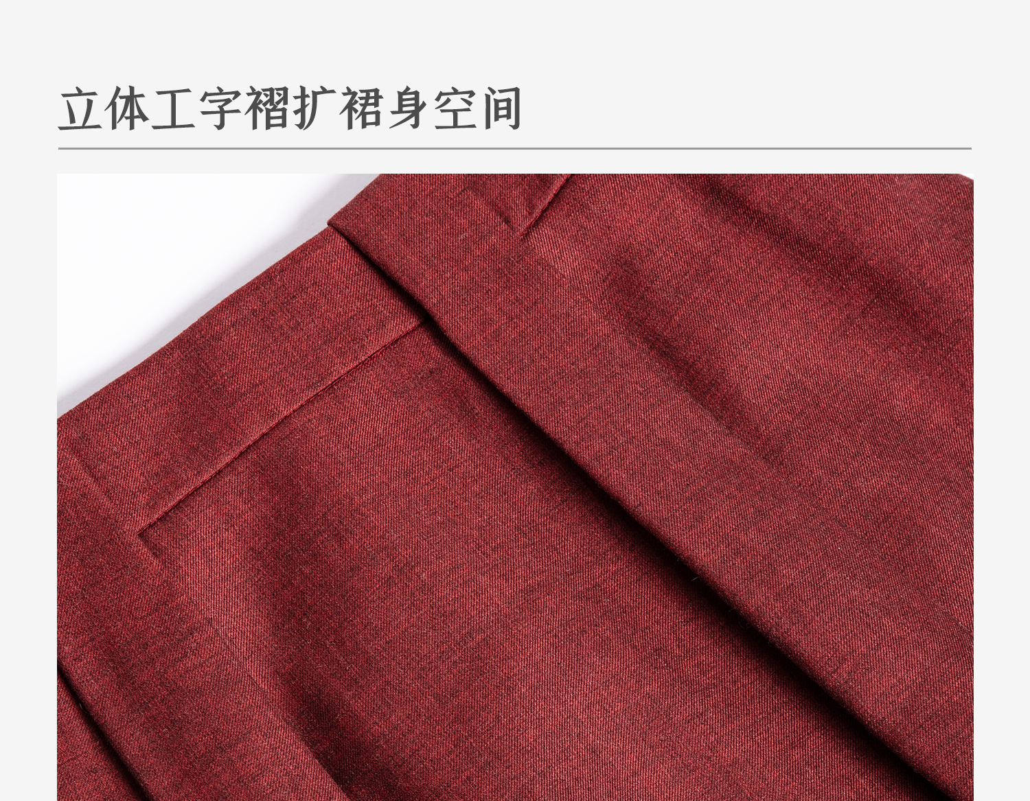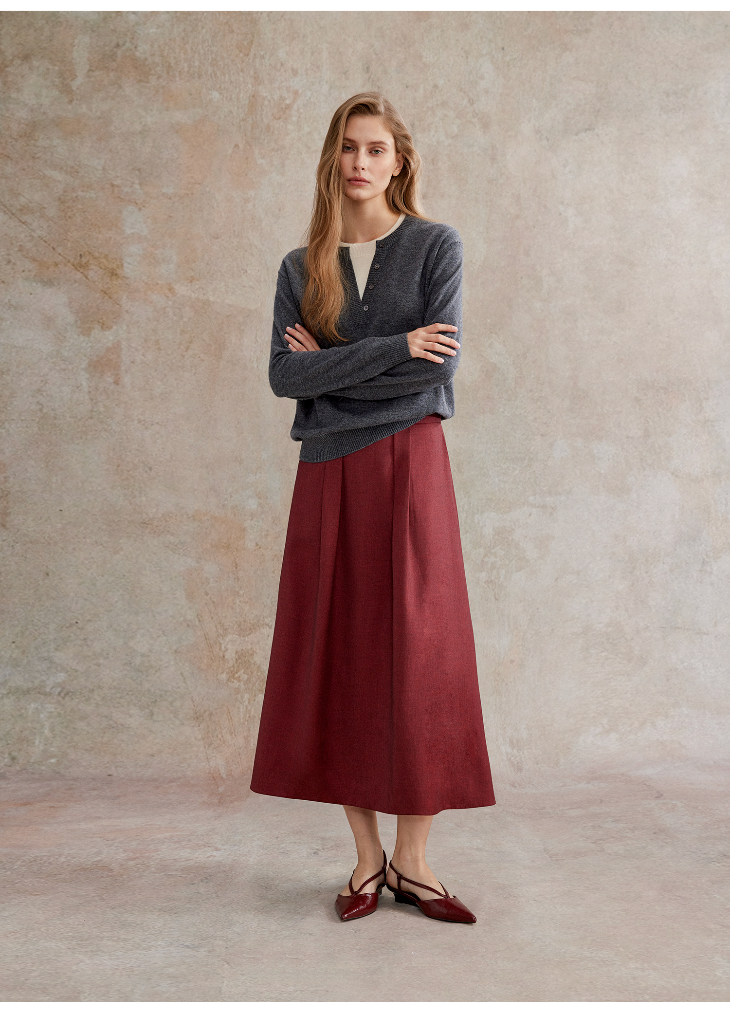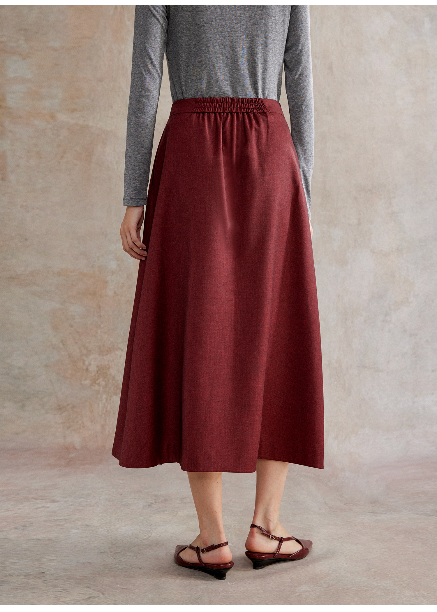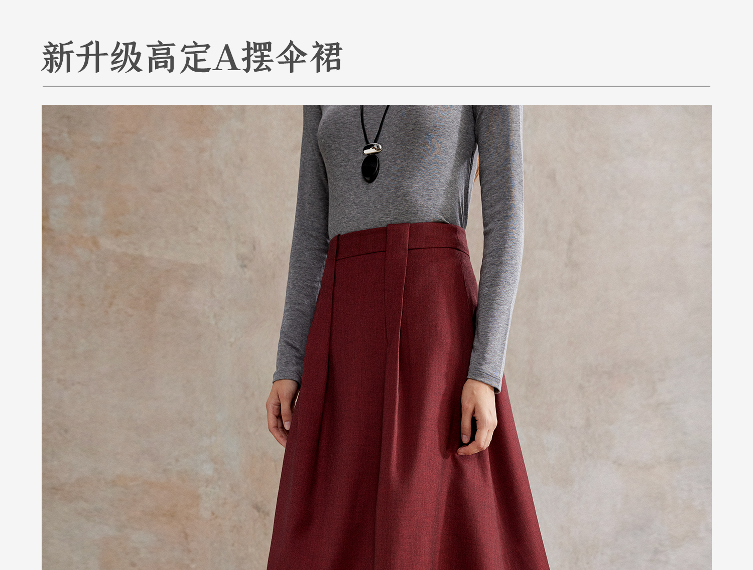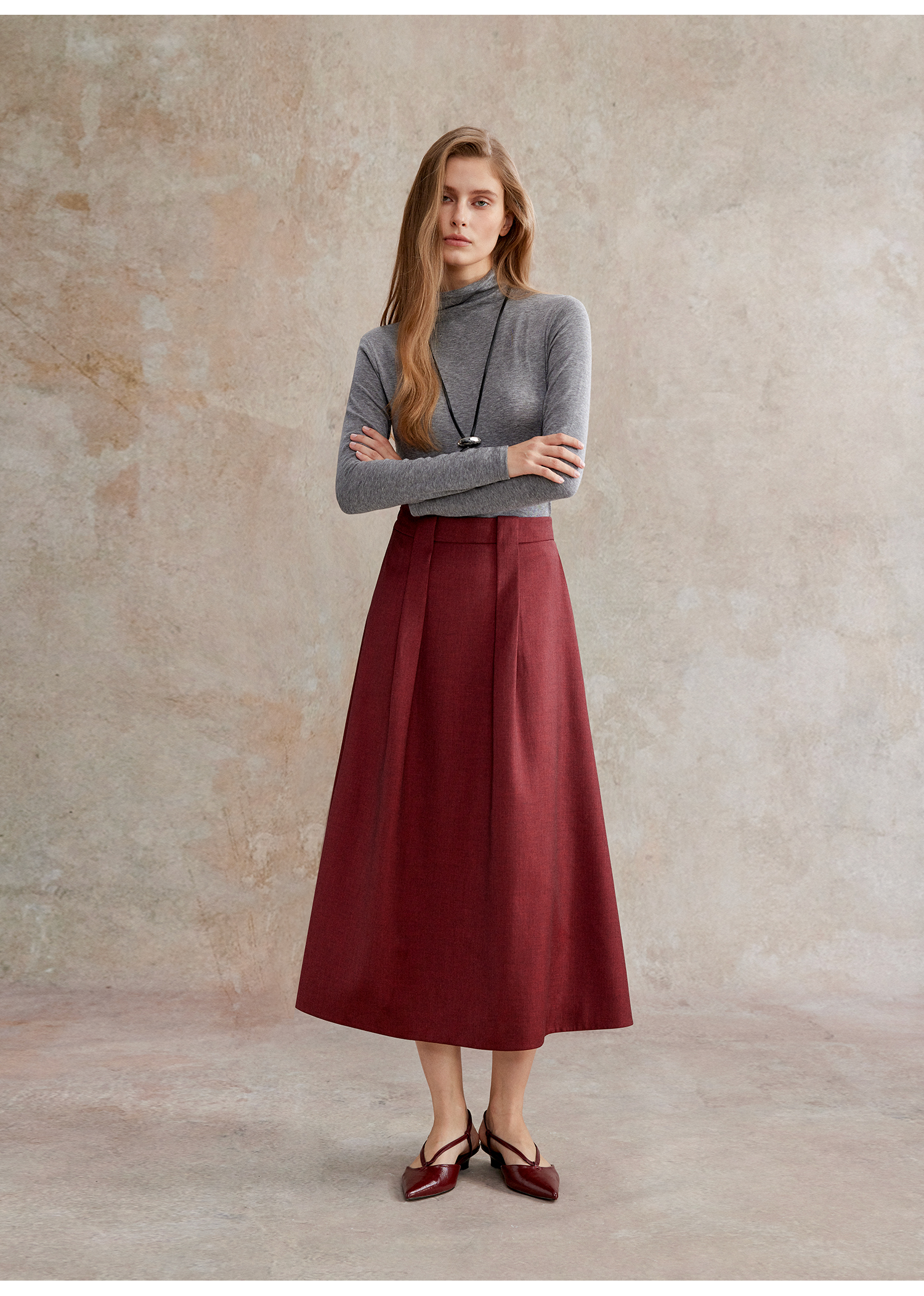 精纺羊毛经典优雅A字伞裙复古红色褶裥半身裙BQ2504073