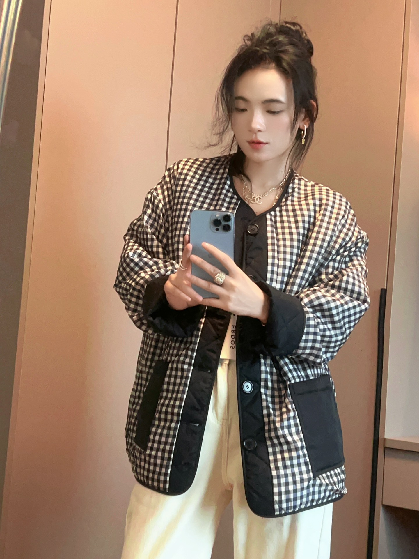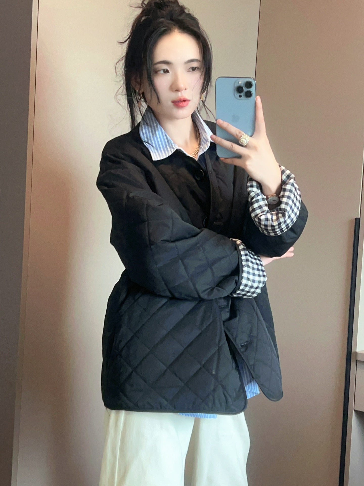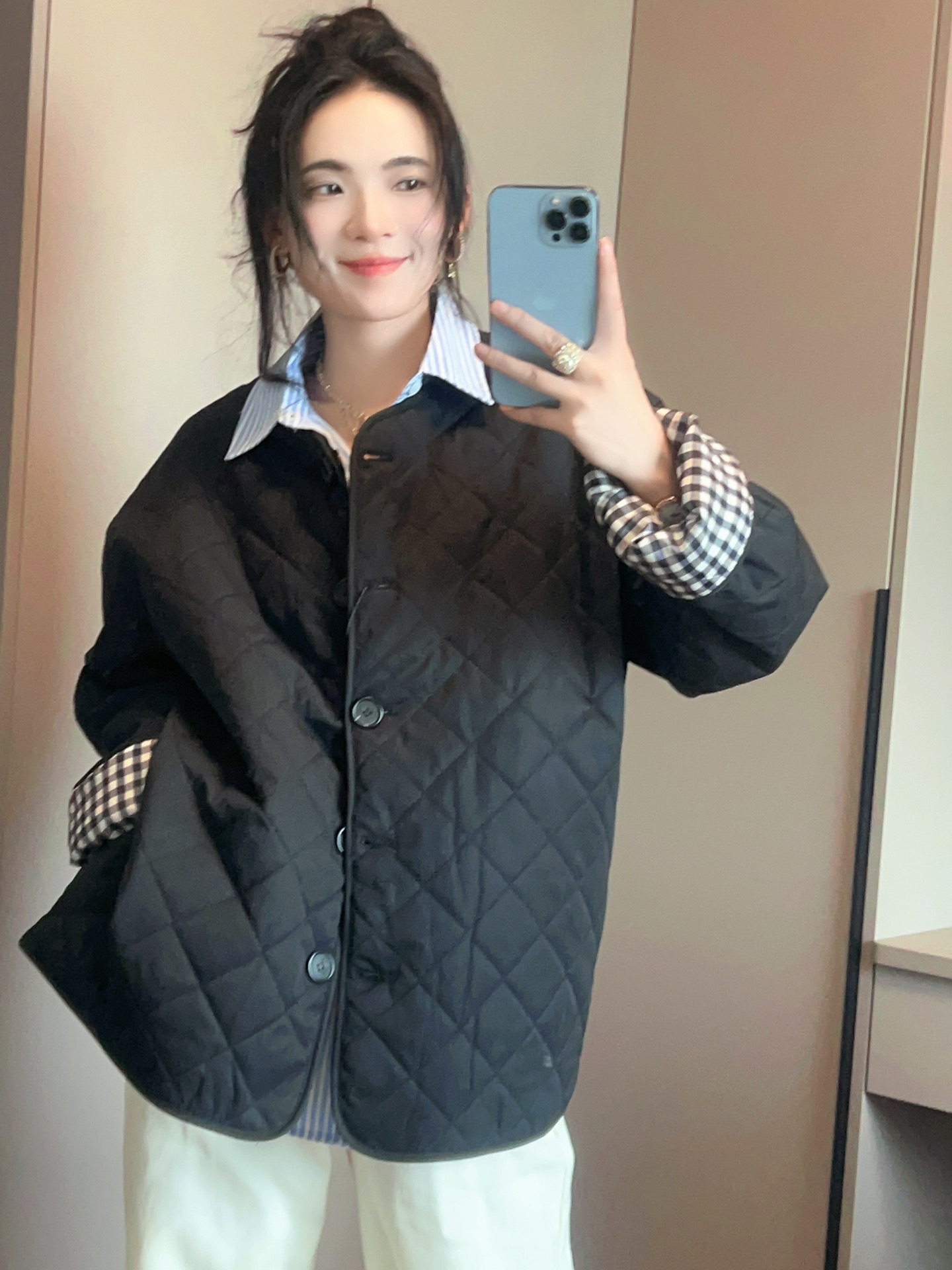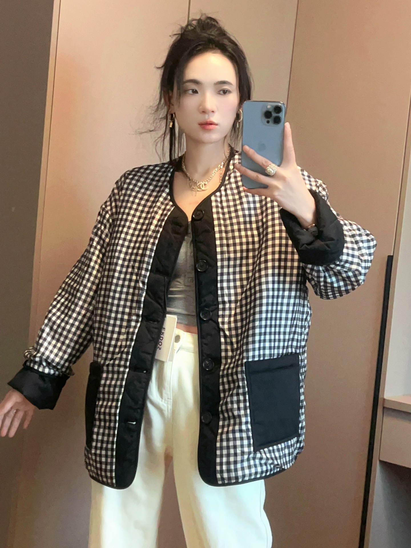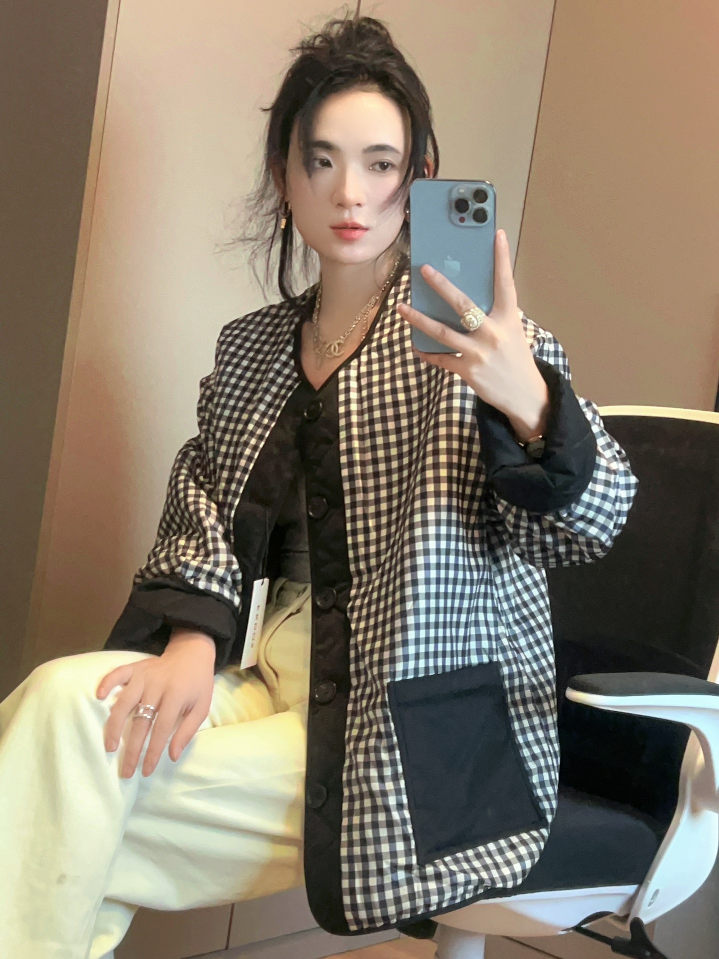 ERD&OS 轻便夹克棉服女23冬季新品V领复古菱型格纹两穿宽松外套,正反两面穿!
