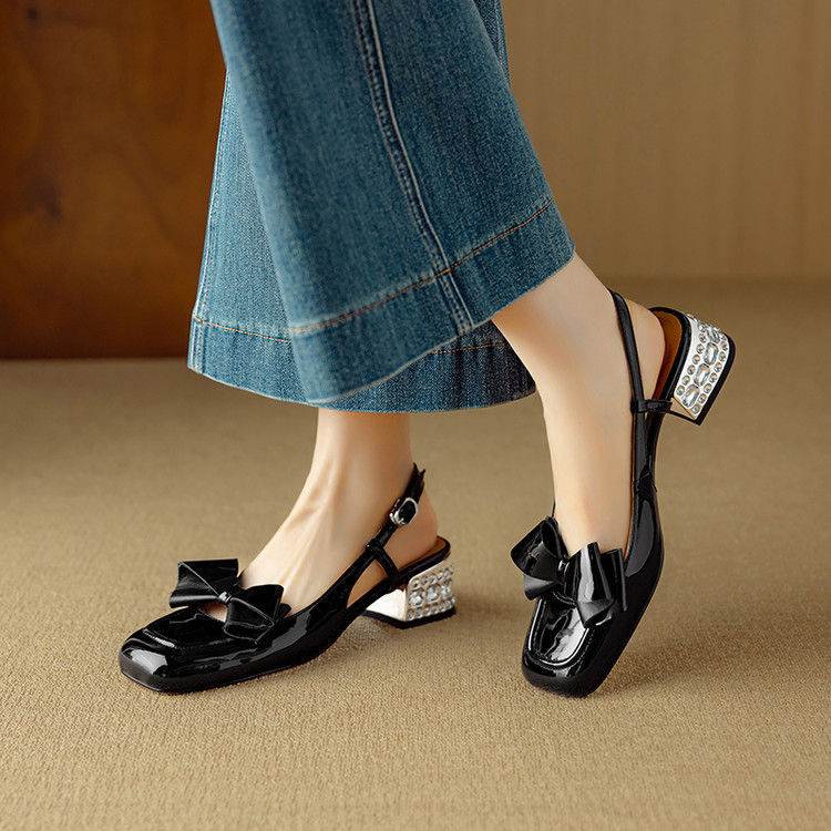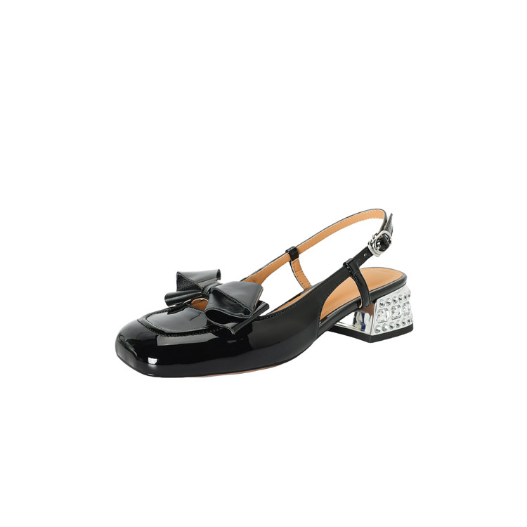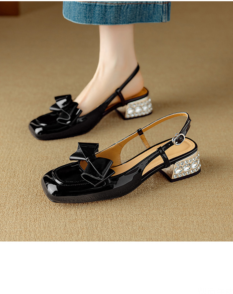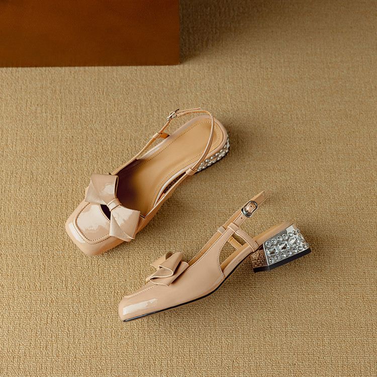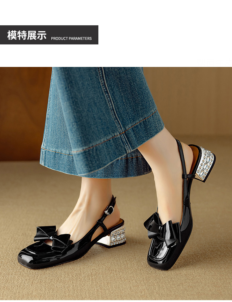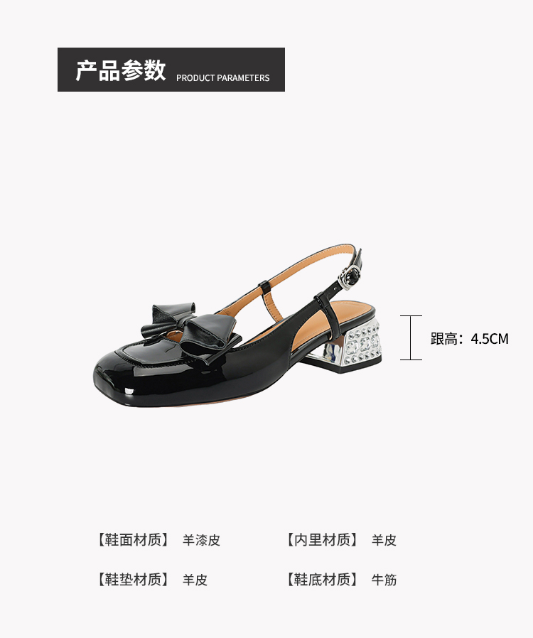 【预售5天】巨好看~水钻粗跟后绊带包头凉鞋女方头甜美蝴蝶结漆皮中空鞋NJMK&K1332