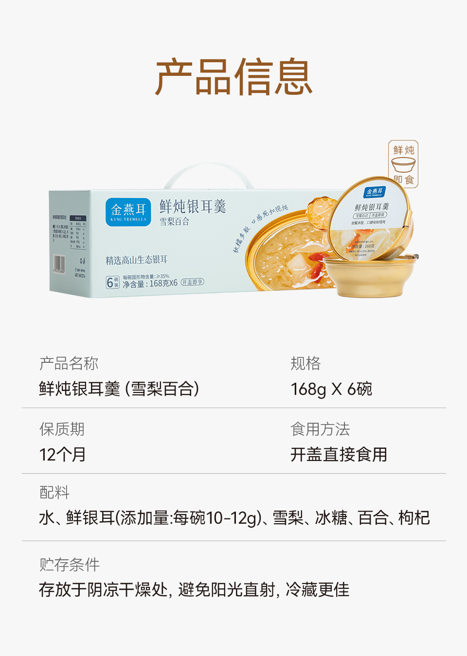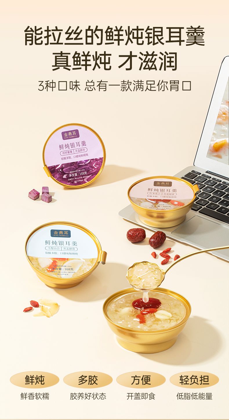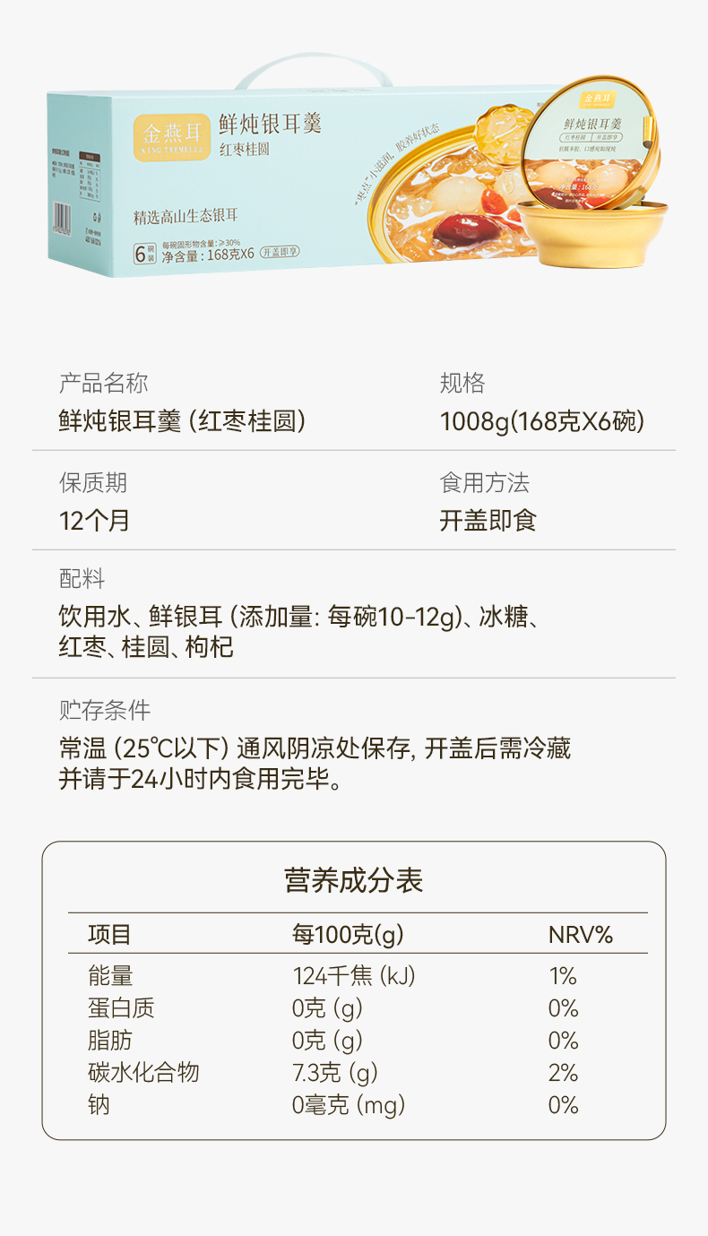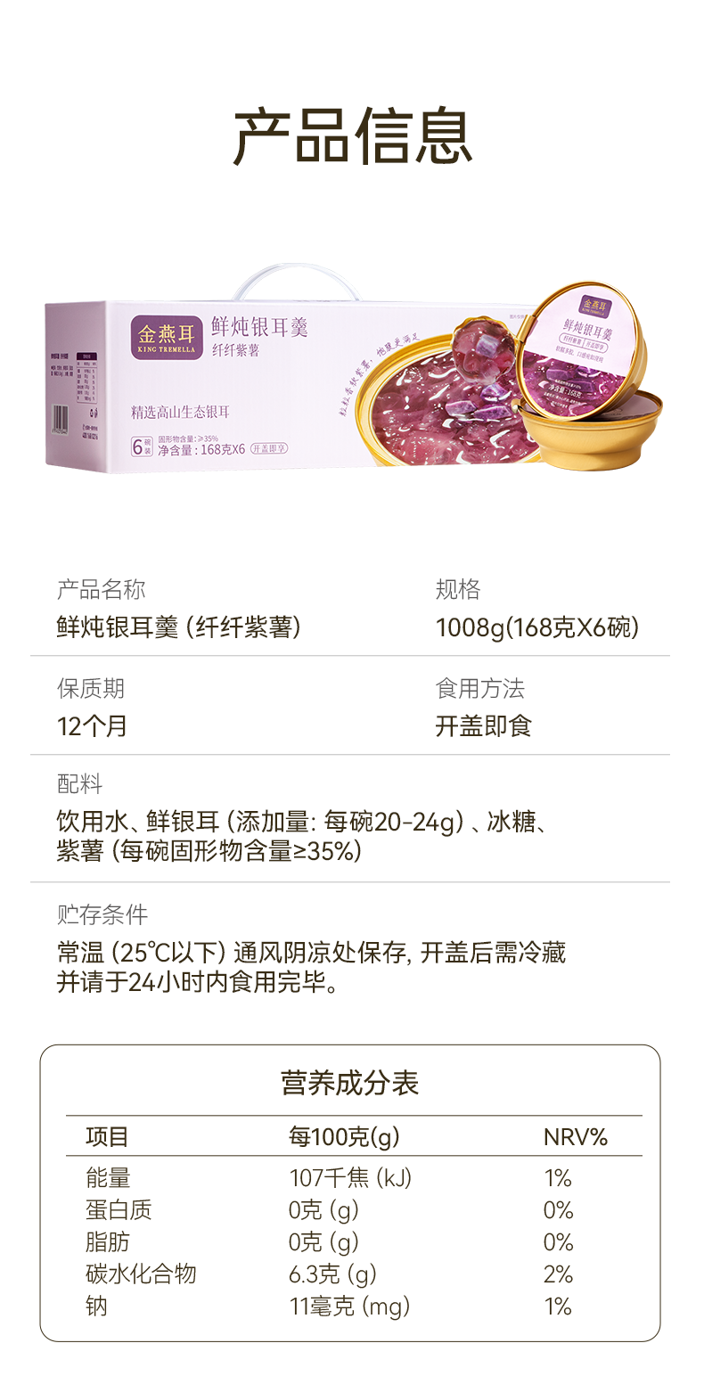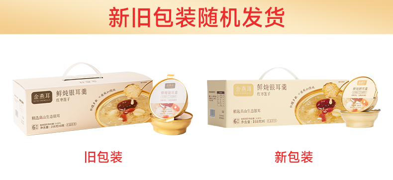 金燕耳有机即食鲜炖银耳羹 168g*6碗 红枣桂圆/雪梨百合/红枣莲子/紫薯四个口味 3秒开盖即食 口感如现炖 雪梨百合、红枣莲子新旧包装混发(购买2箱以上的快递可能会分多个包裹发货 请注意查收)