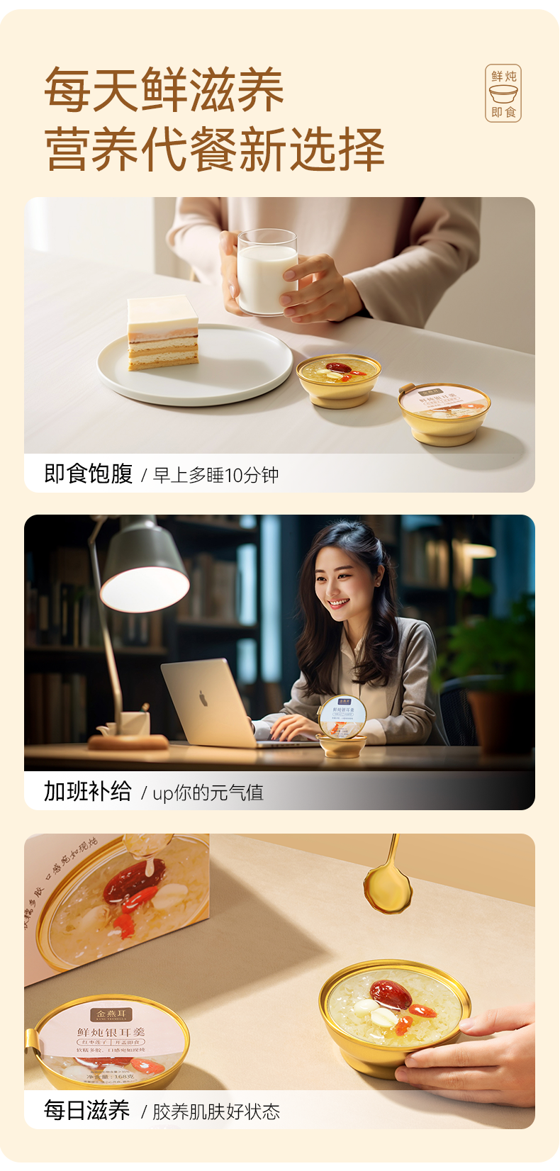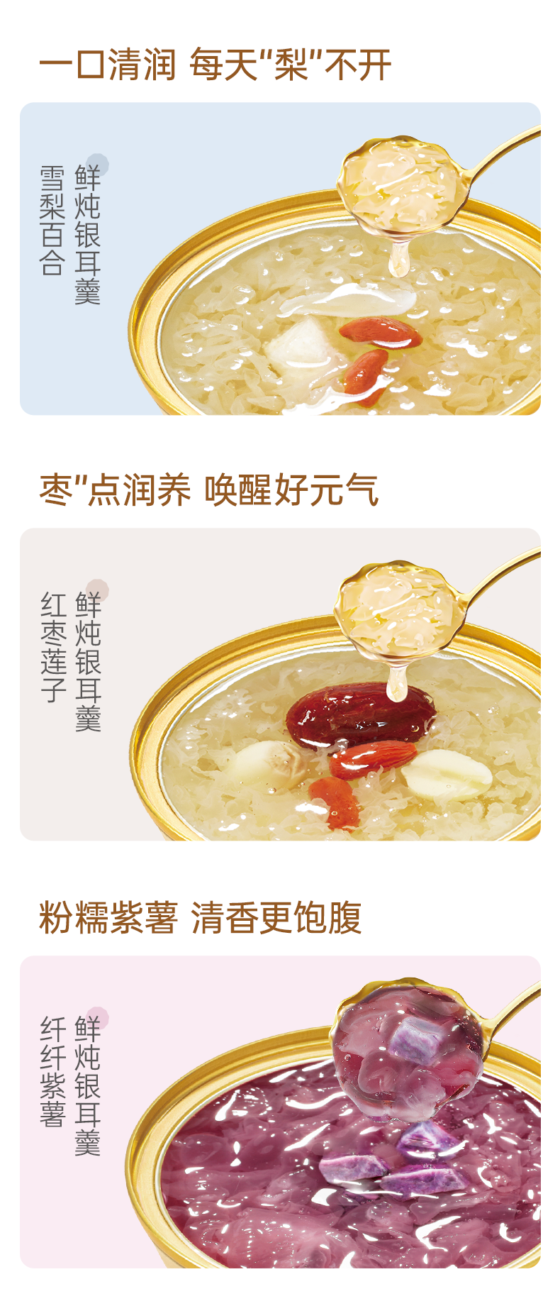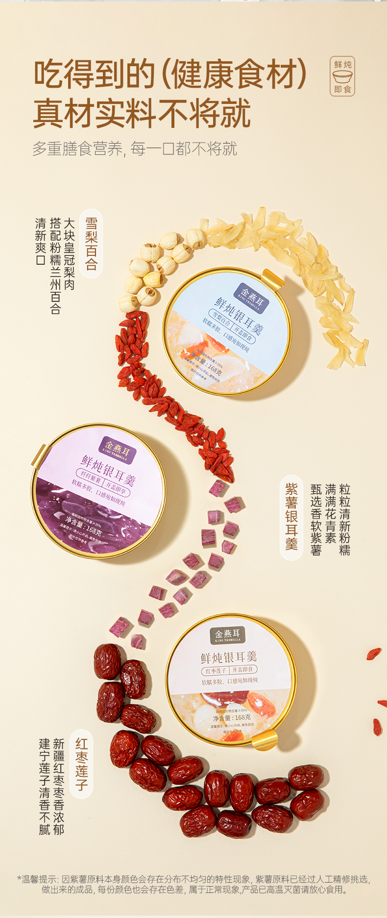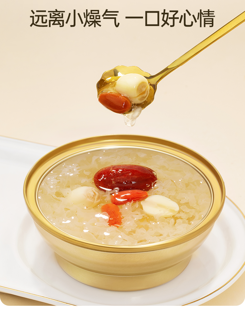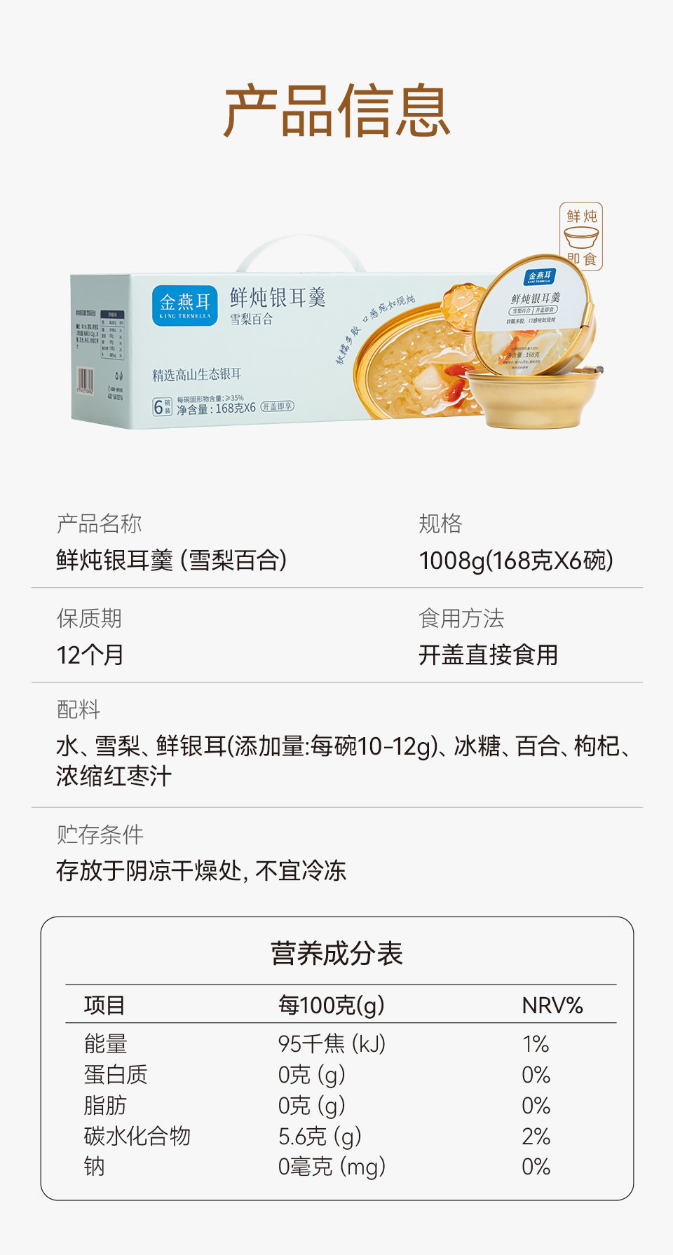 金燕耳有机即食鲜炖银耳羹 168g*6碗 红枣桂圆/雪梨百合/红枣莲子/紫薯四个口味 3秒开盖即食 口感如现炖 雪梨百合、红枣莲子新旧包装混发(购买2箱以上的快递可能会分多个包裹发货 请注意查收)