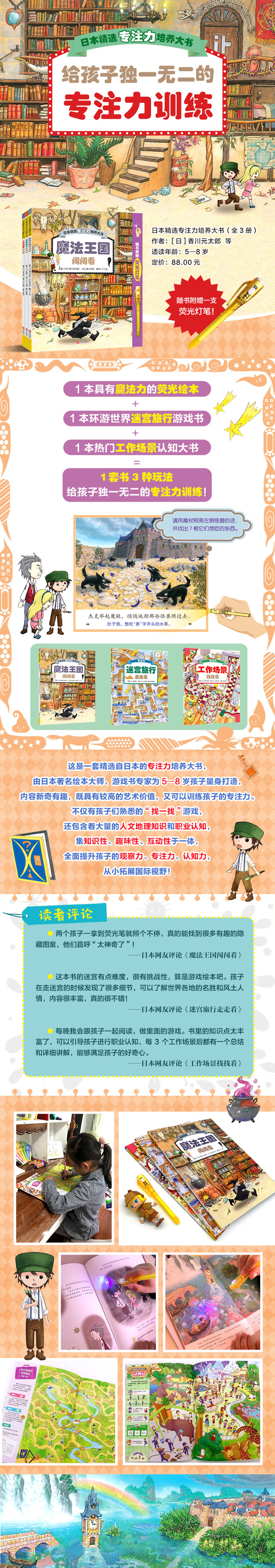 这是一套专为3-6岁孩子打造的专注力训练绘本,内容新奇有趣,包含着大量的人文地理知识和职业认知,让孩子边玩边学,轻松提高观察力、专注力、认知力,拓展国际视野。