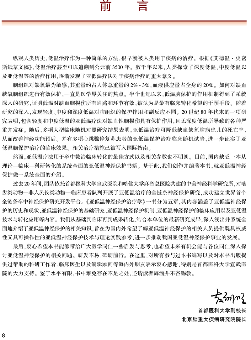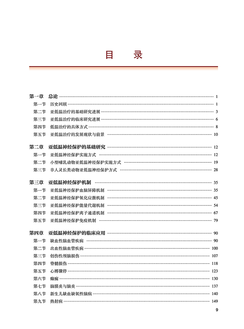 第一部分:总论,回顾低温神经保护研究历史、概述现状并进行展望;第二部分:亚低温神经保护基础研究,围绕啮齿类、小型哺乳类和非人灵长类动物实验展开论述;第三部分:针对亚低温神经保护机制,如血脑屏障、氧化应激、能量代谢等机制展开论述;第四部分:亚低温神经保护临床研究,围绕缺血性脑卒中、出血性脑卒中、创伤性颅脑损伤、脊髓损伤等疾病展开论述;第五部分:亚低温技术与转化,从低温方式,包括体表低温、体内低温展开论述,同时介绍低温脑保护设备以及计算模拟结果。