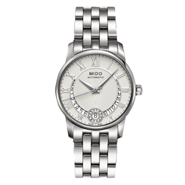 镜面 材质 | 蓝宝石水晶玻璃 | 表盘 | 不锈钢表壳 银色表盘 大三针 日期显示 罗马数字时标 表盘镶嵌12颗钻石(0.025克拉) 透底 |