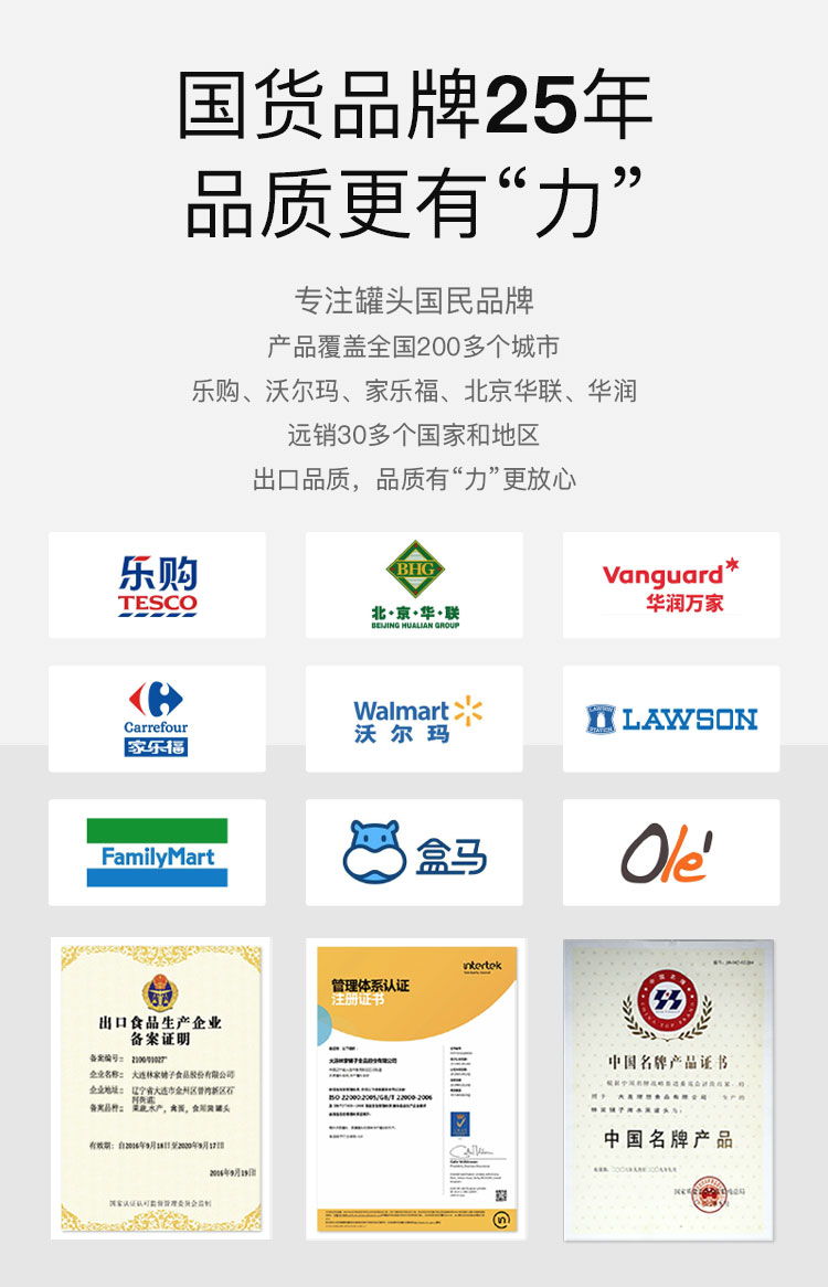 大连林家铺子食品股份有限公司成立于1996年,是中国知名及东北地区最大的罐头生产商、出口商。公司坚持“赋予产品以文化,做世界上最好的罐头”,不断最求高品质打造成年轻人也爱吃的国民零食