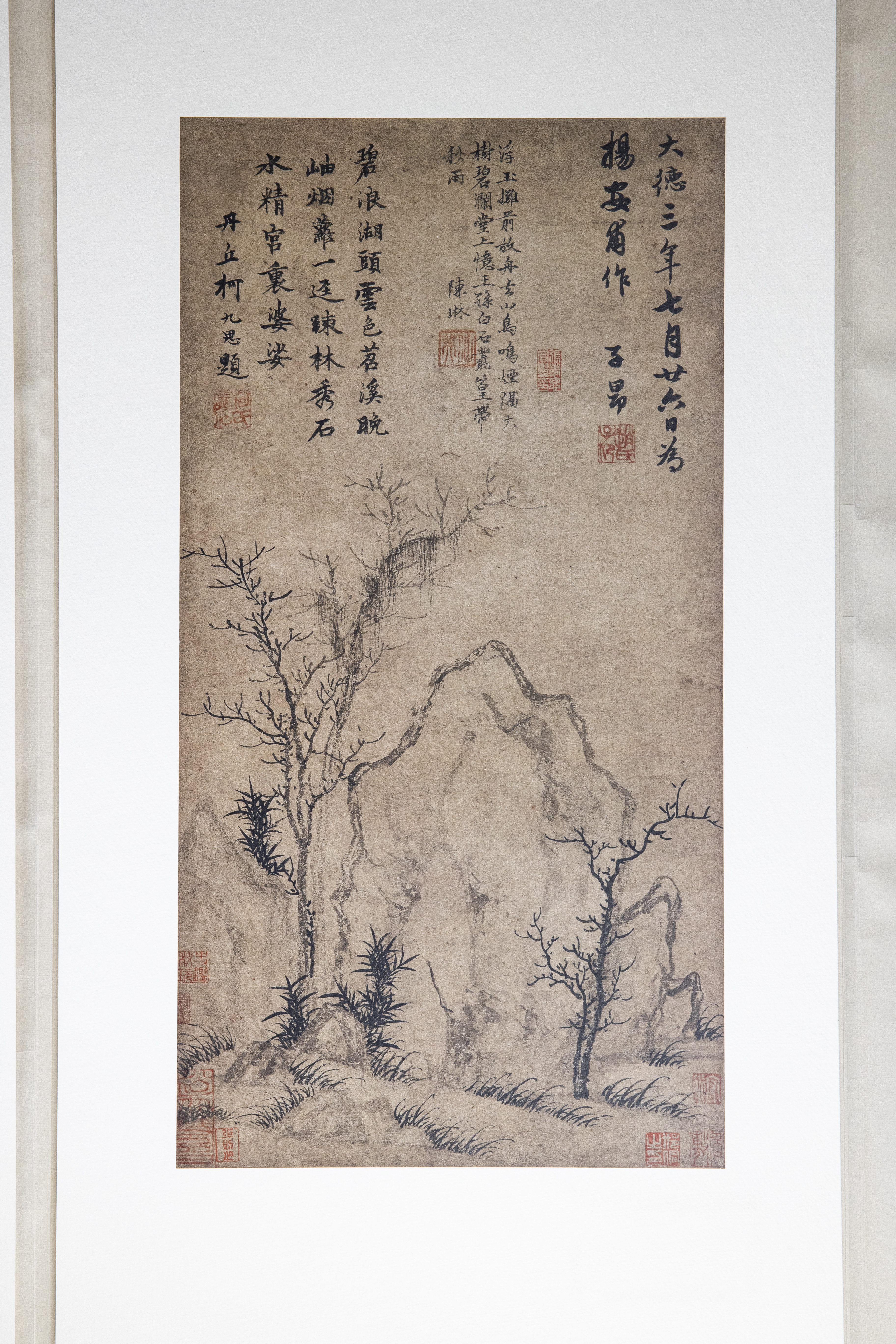 八张作品分别是:宋梁楷<泼墨仙人>、元赵孟頫<疏林秀石>、元顾安<拳石新篁>、明文征明<秋葵折枝><兰竹图>、明唐寅<立石丛卉>、明陆治<雪后访梅图>、明文嘉<石湖秋色>。