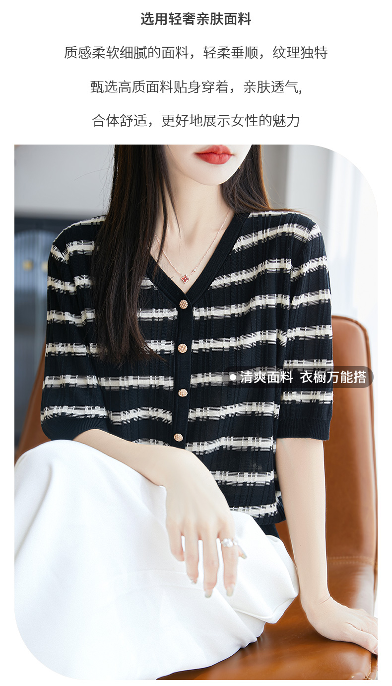 板绘小香风条纹V领针织短袖 莱赛尔材质冰丝凉爽 轻奢小香风气质 轻薄透气 显瘦百搭 商品图5