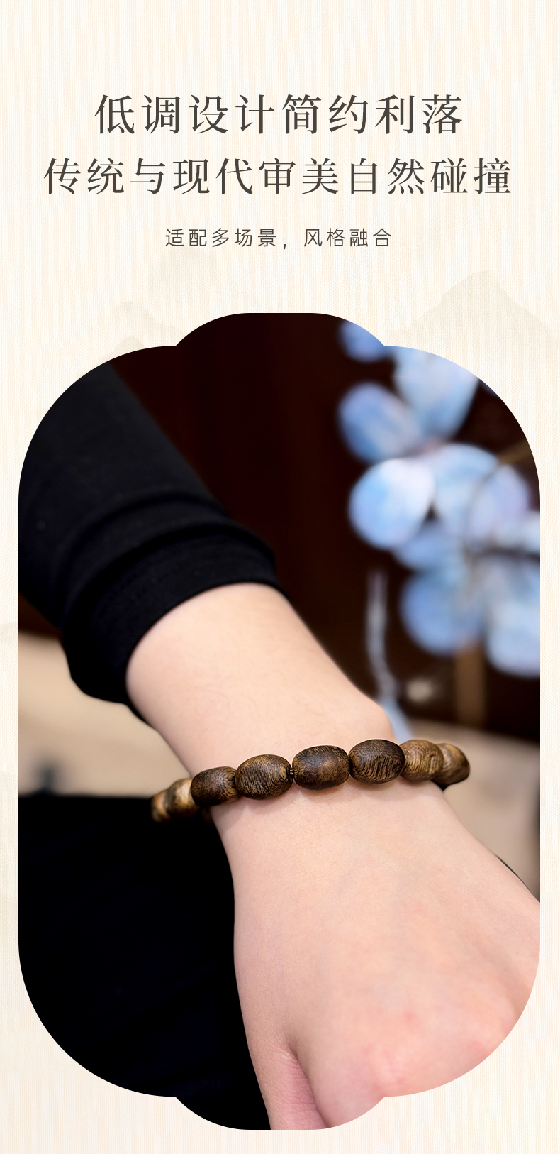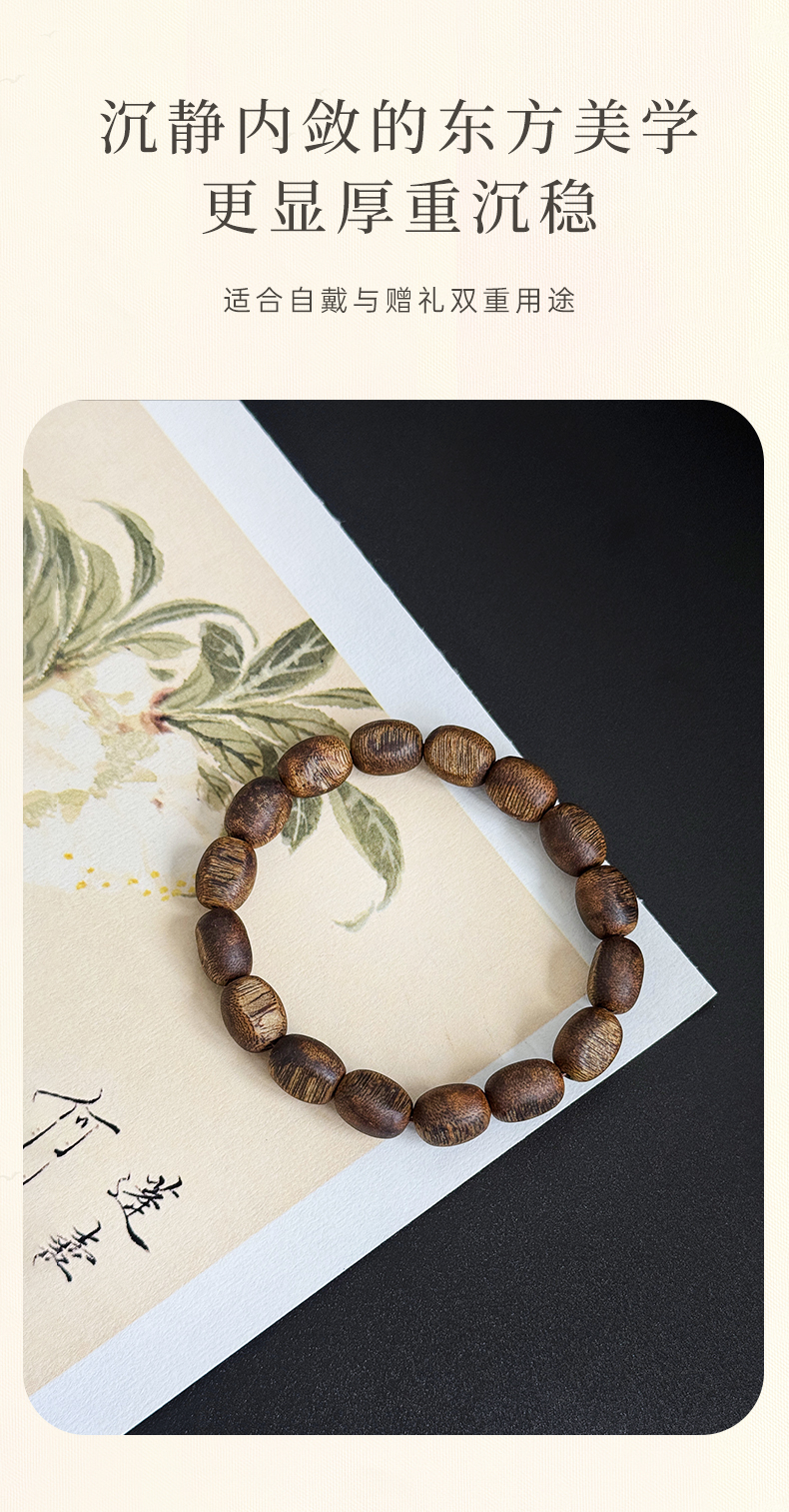 5、无需盘玩:沉香贵为众香之首与紫檀、花梨等木串不同。沉香手串不建议刻意盘玩,盘玩会形成包浆(一层氧化膜)堵住毛孔,使其香味无法散发。正常佩戴即可,人体油脂的滋润就是好的保养。