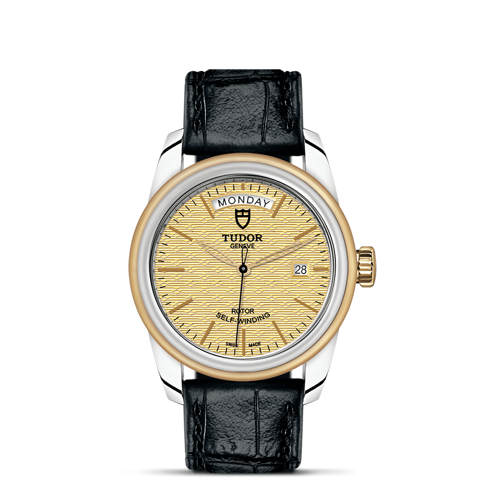 旋入式上链錶冠,饰以帝舵表标志;精钢覆有0.1毫米18K黄金薄层
