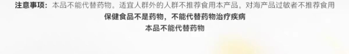 【注意事项】:本品不能代替药物。适宜人群外的人群不推荐食用本产品。对海产品过敏者不推荐食用。