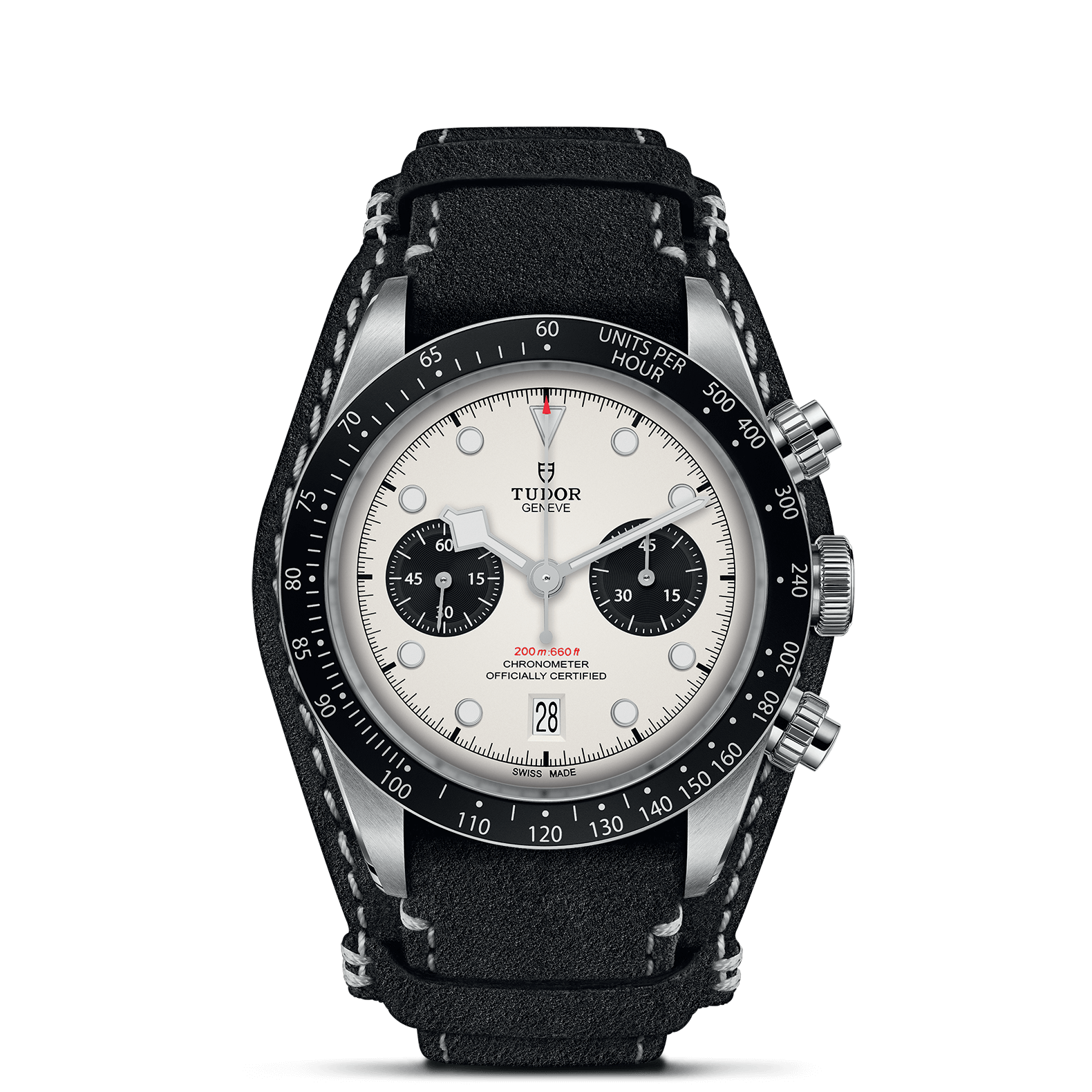 圆拱形,蛋白色表盘搭配黑色计时盘