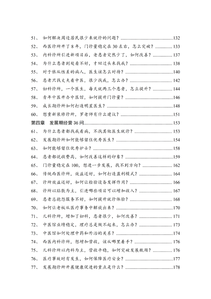 王牌诊所辅导师罗斌老师在诊所辅导过程中,发现关于诊所经营的一些基本问题始终困扰着诊所经营者。为了解决这些常见问题,常常要花费很多的精力去摸索,往往还不得法,不但浪费了时间,还走了很多弯路。鉴于此,罗斌老师结合当下形势,总结多年辅导经验,特别编辑了《诊所经营百问百答》这本小册子,汇总了不同发展阶段诊所常见的100个问题,并给出解决方案或方法。包括准备开办诊所,新开办的诊所,生存期诊所,发展期诊所,事业期诊所等不同阶段遇到的各种问题和困惑,解决方法简单实用有效。希望能帮助诊所经营者解答实践中遇到的各种具体问题,少走弯路,助力诊所发展。