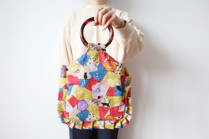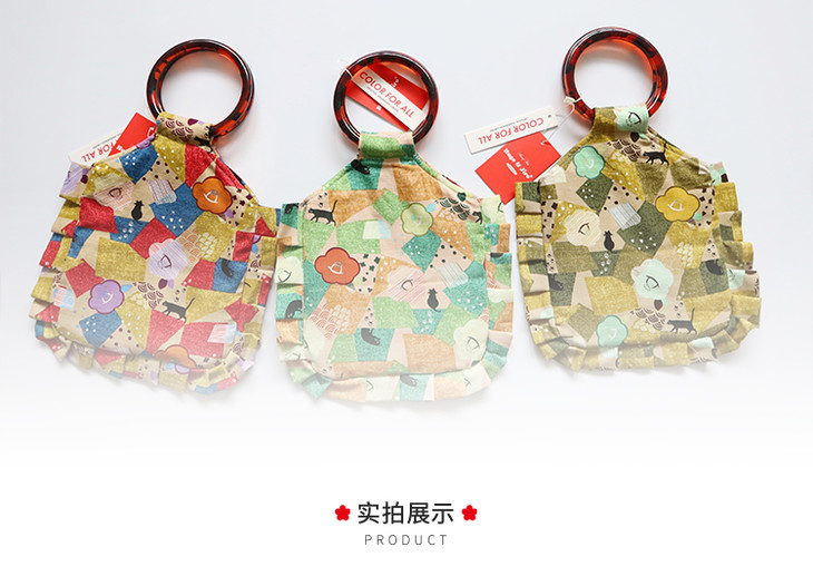 HUGOJIRO荷叶边圆环柄手提包插画散步小猫