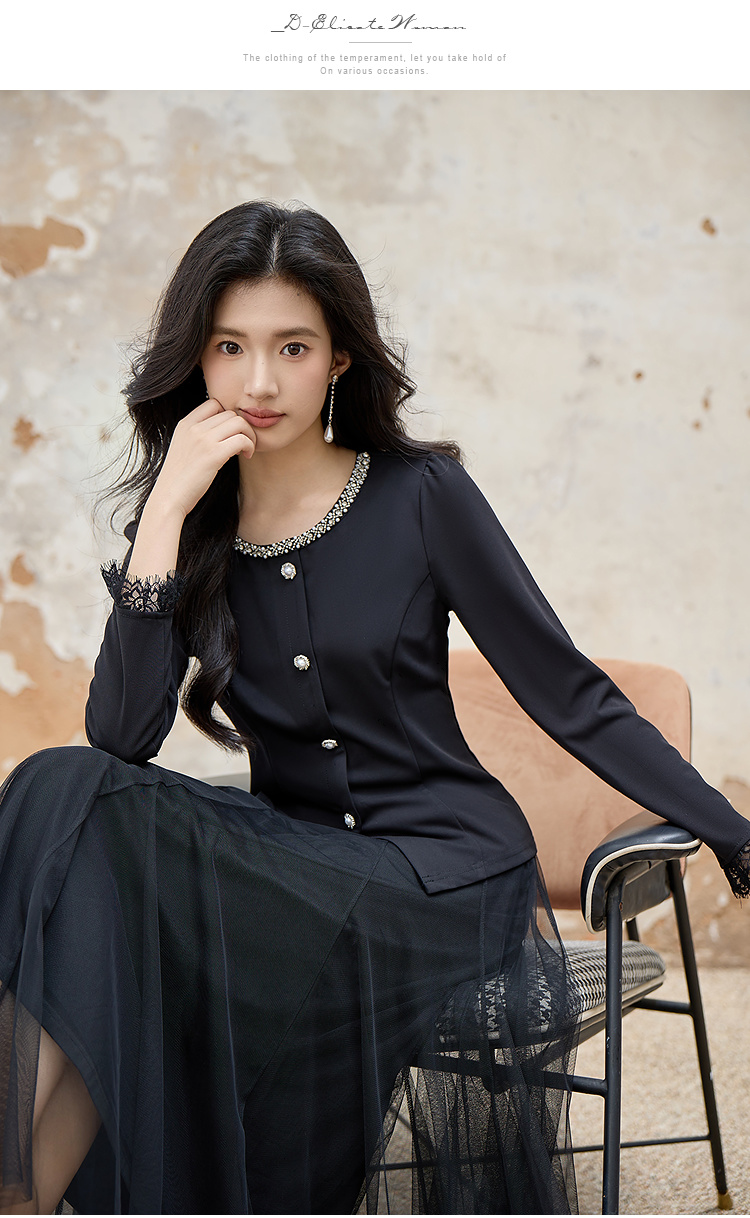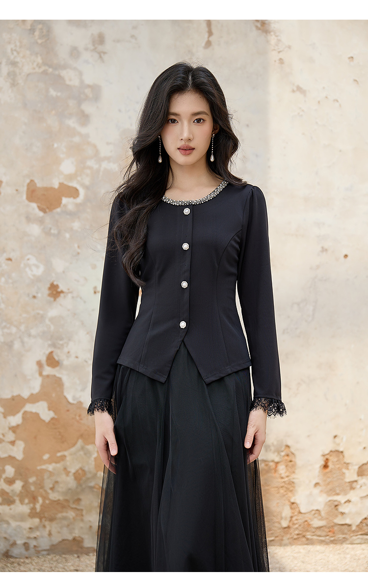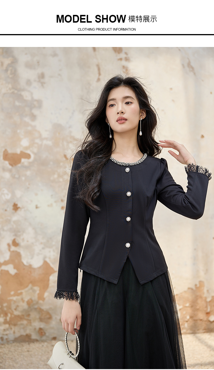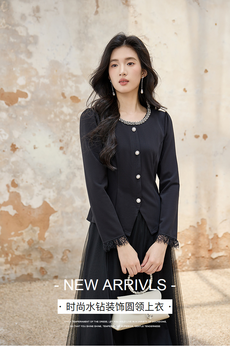 奢姿大码女装2025秋季胖妹妹时尚水钻装饰气质蕾丝拼接圆领上衣9953253603A