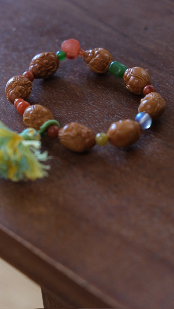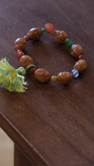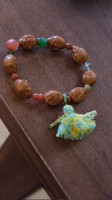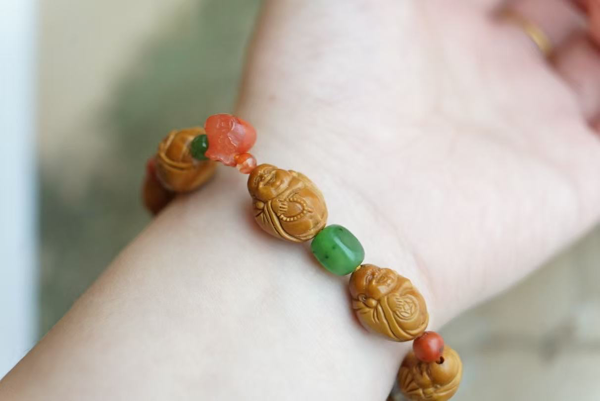 小佛开脸精美出彩,肌肉饱满,笑容可掬,手上拿着不同的东东,有念珠,有钱币~搭配多宝隔珠,南红玛瑙钱袋子,碧玉,南红葫芦,黄翡翠,包浆南红玛瑙,灰月光等等。