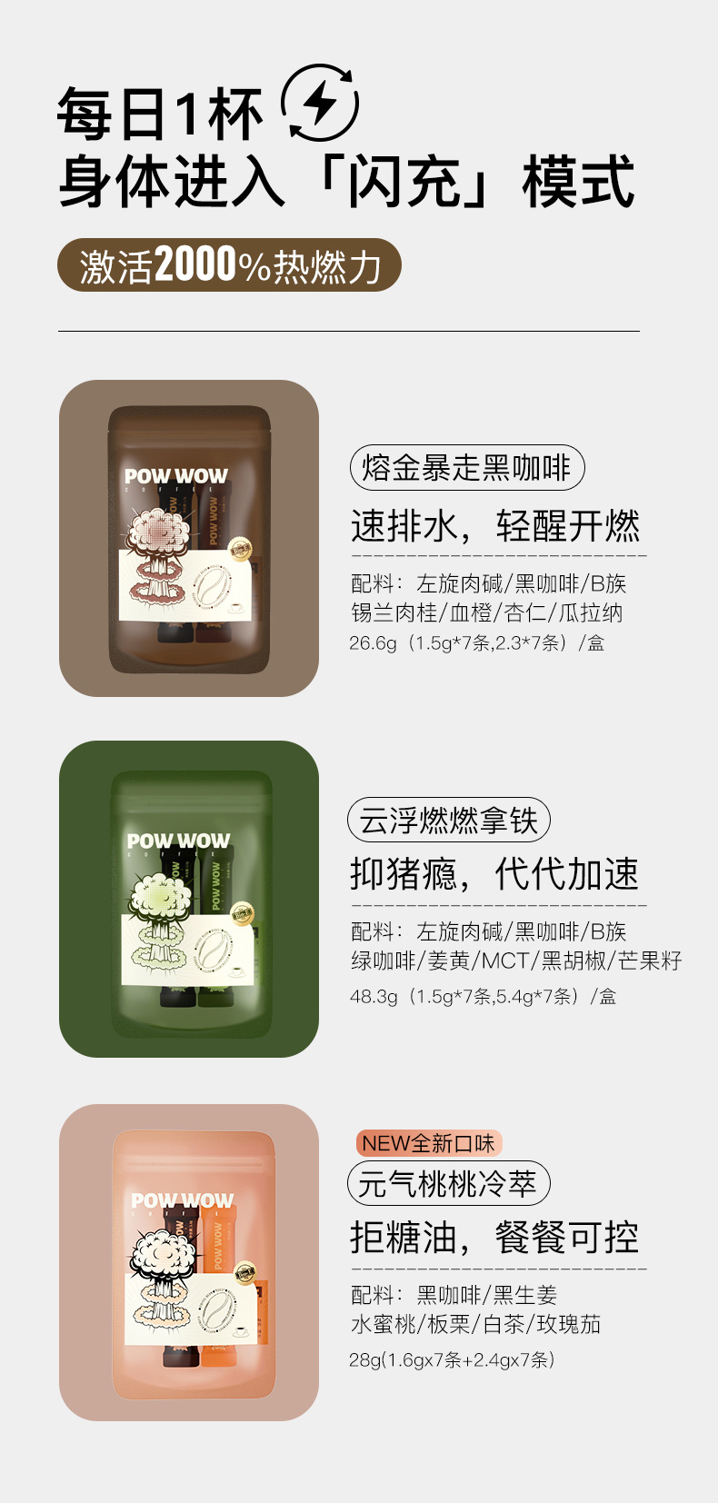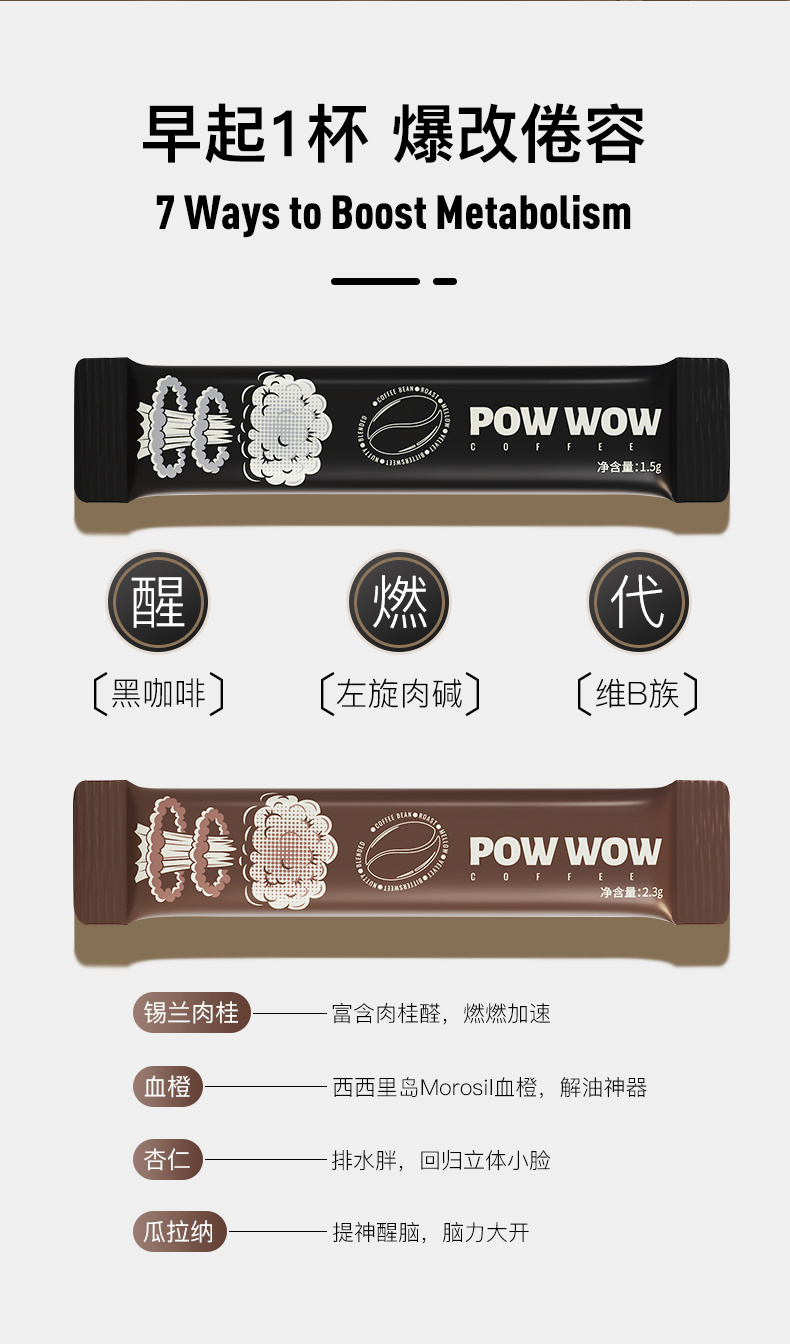 阿拉比卡和罗布斯塔两大咖啡搭配左旋肉碱、B族、姜黄、火山血橙、锡兰肉桂、绿咖啡、MCT、白茶、栗子皮、玫瑰茄多成分助力燃卡,真的超级给力👍🏻!