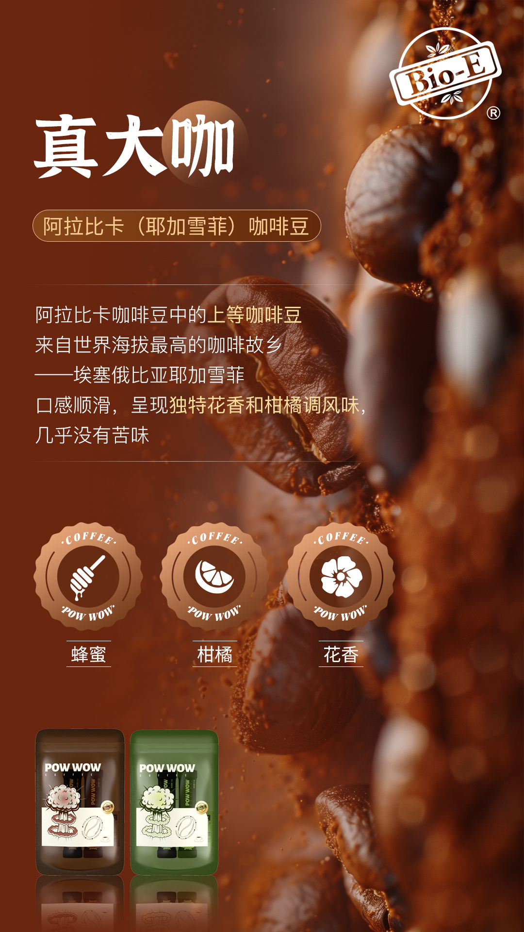 Bio-E爆爆咖啡由【阿拉比卡】和【罗布斯塔】两大精品咖啡豆组成,提神效果和风味兼具!